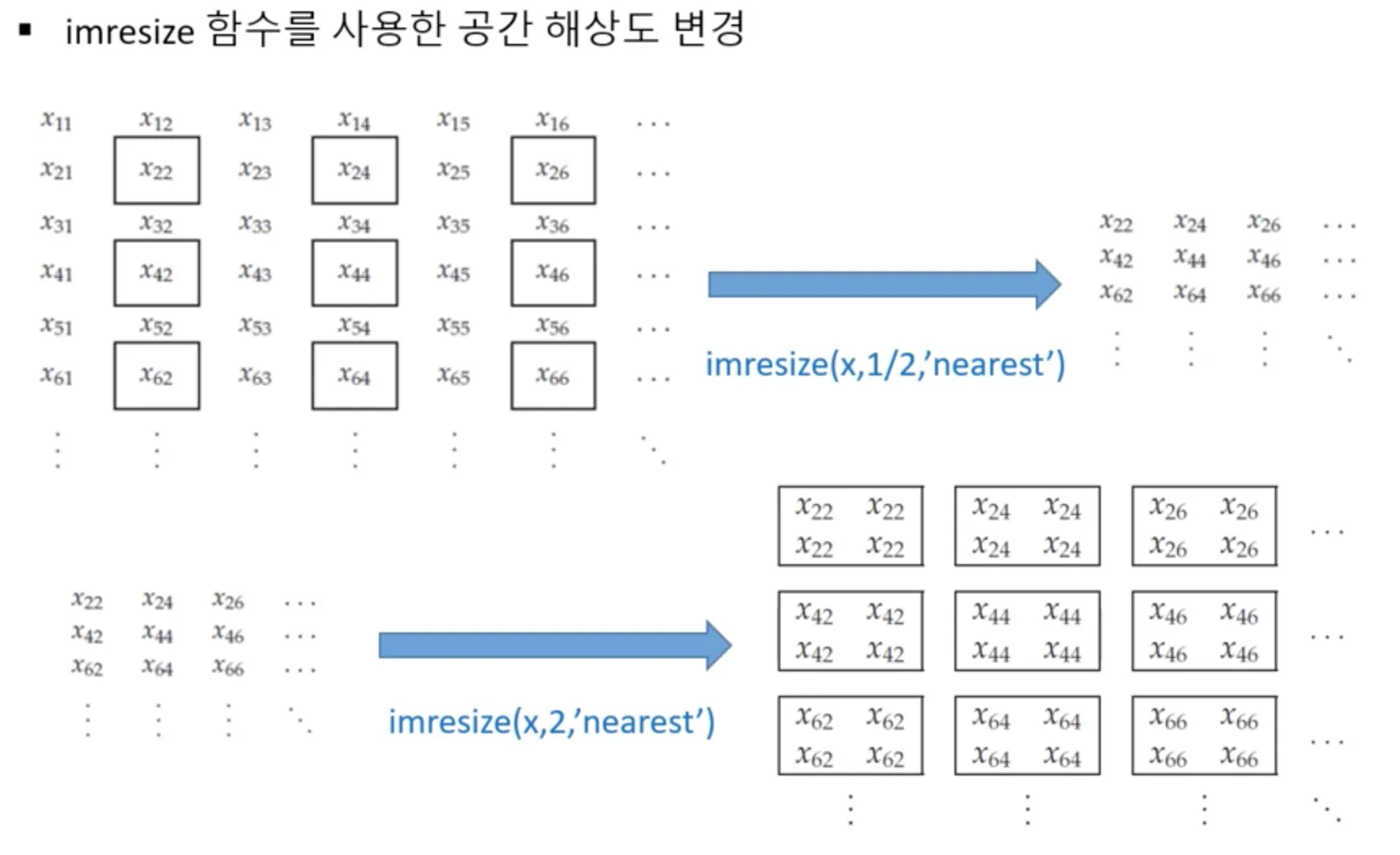 python 에서는 cv2.resize 를 통해 이미지의 공간 해상도를 변경할 수 있다. 위 사진에서는, N by N 이미지를 N/2 by N/2 이미지로 공간 해상도를 줄이고, 이를 다시 N by N 이미지로 공간 해상도를 다시 늘렸다.