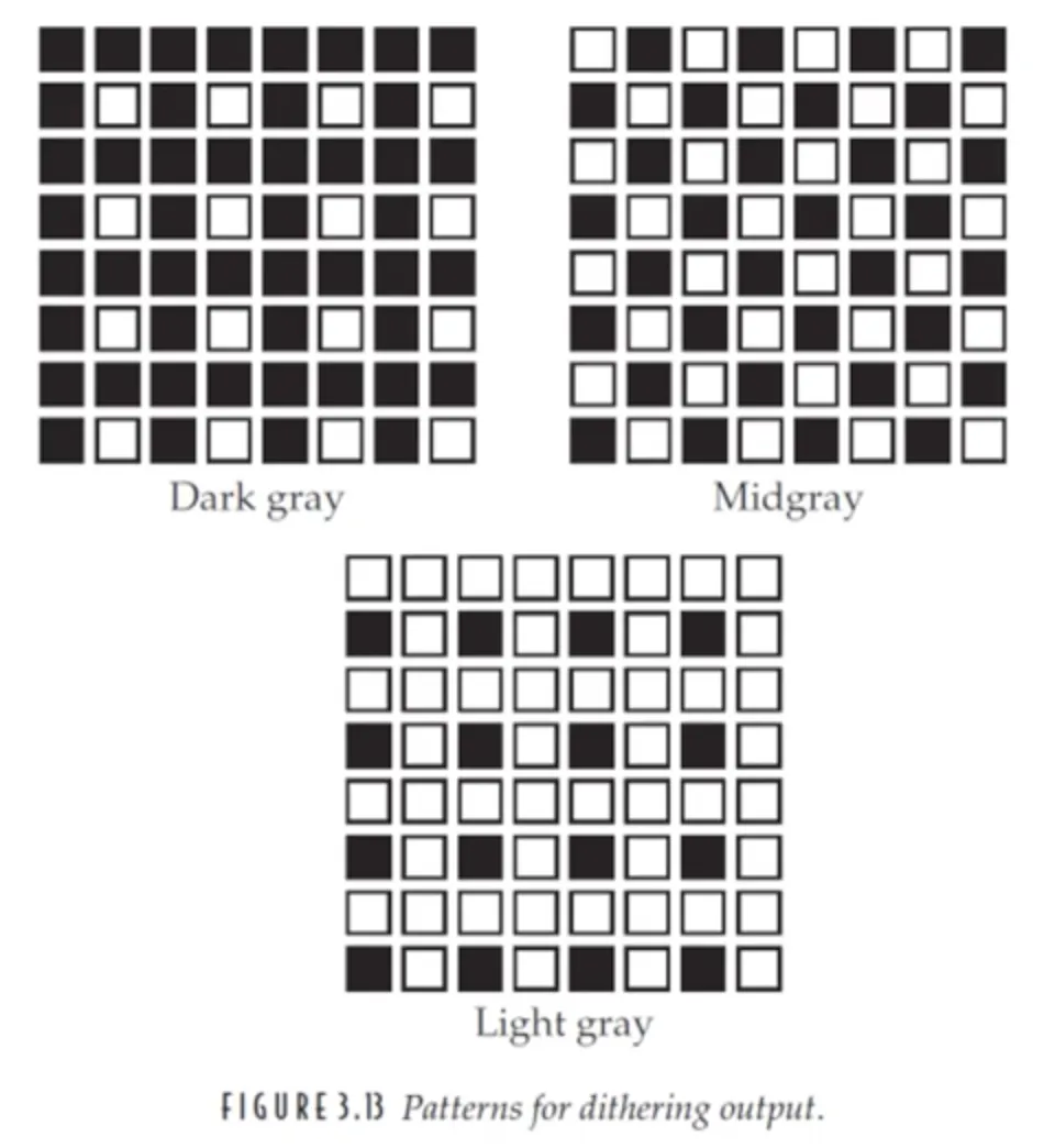 우선, 패턴 처리를 활용한 방법이다. 위 그림처럼, 하나의 화소가 아닌 영역의 밝기에 따라 흑과 백 두 톤의 픽셀비율을 조절하는 방법을 상상할 수 있다.
