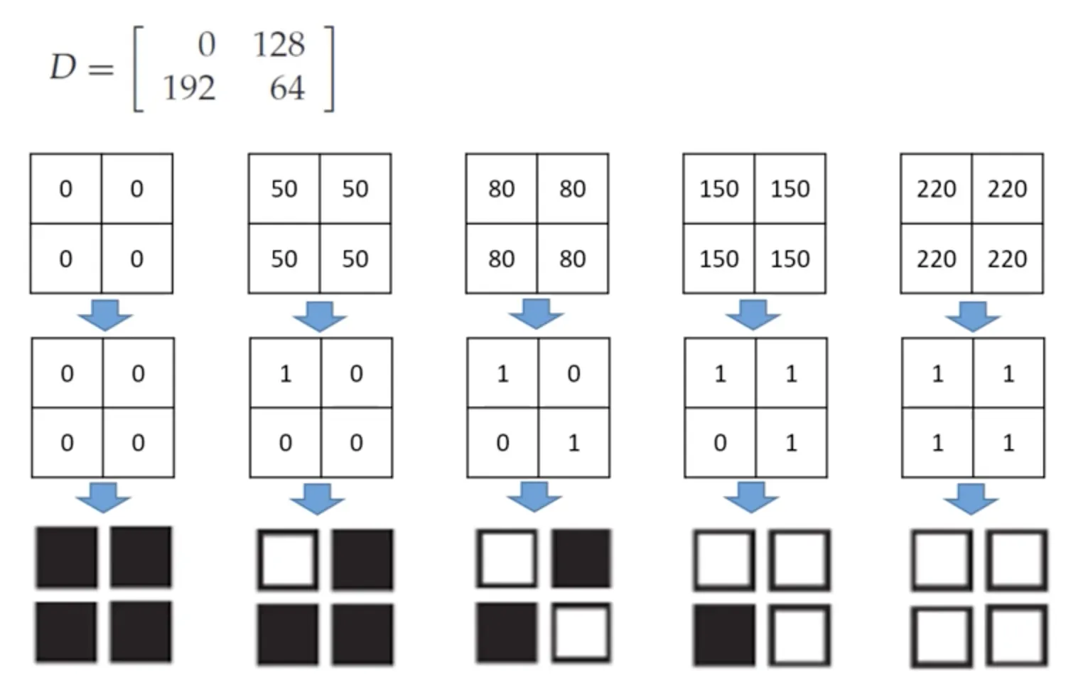 갑자기 행렬이 나와서 당황스러울 수 있지만, 결국 그냥 네 픽셀과 행렬의 네 요소를 비교해서 크면 1, 작으면 0 을 그 위치에 대입하겠다는 것이다.