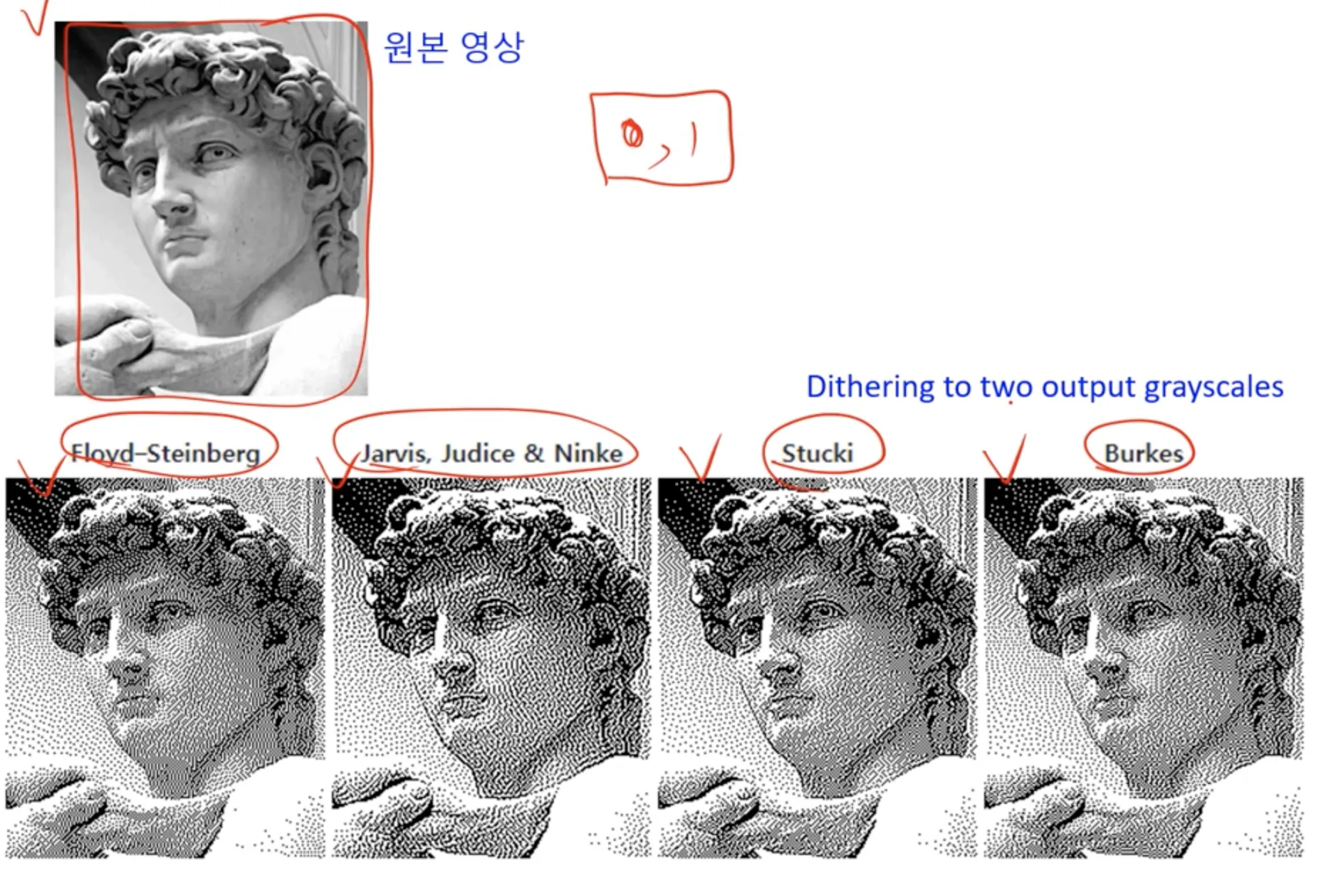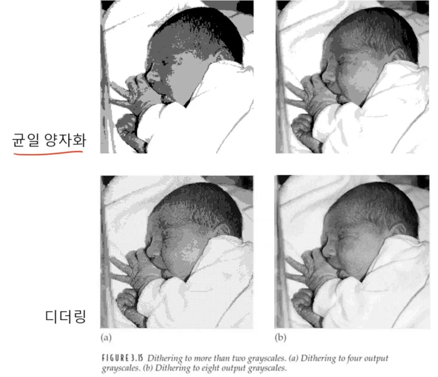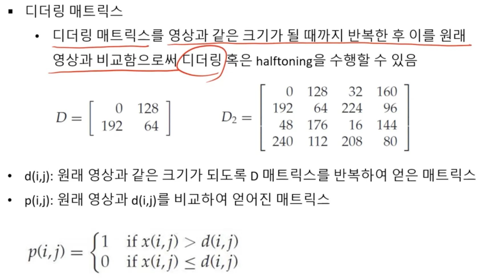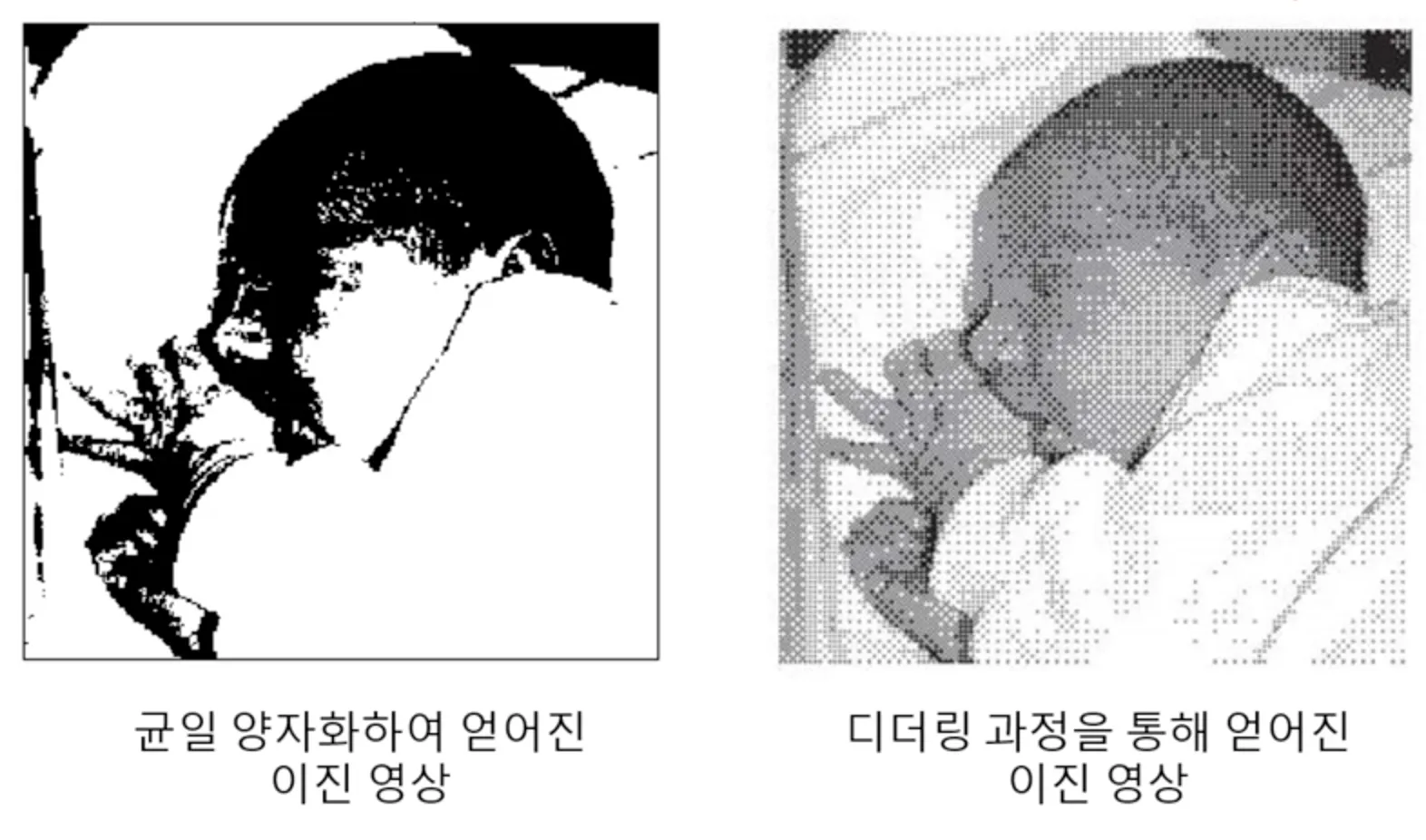 디더링 (dithering) 은 quantization 을 하면서도 영상의 quality 를 떨어뜨리지 않는, 컬러의 수 축소 방법이다.