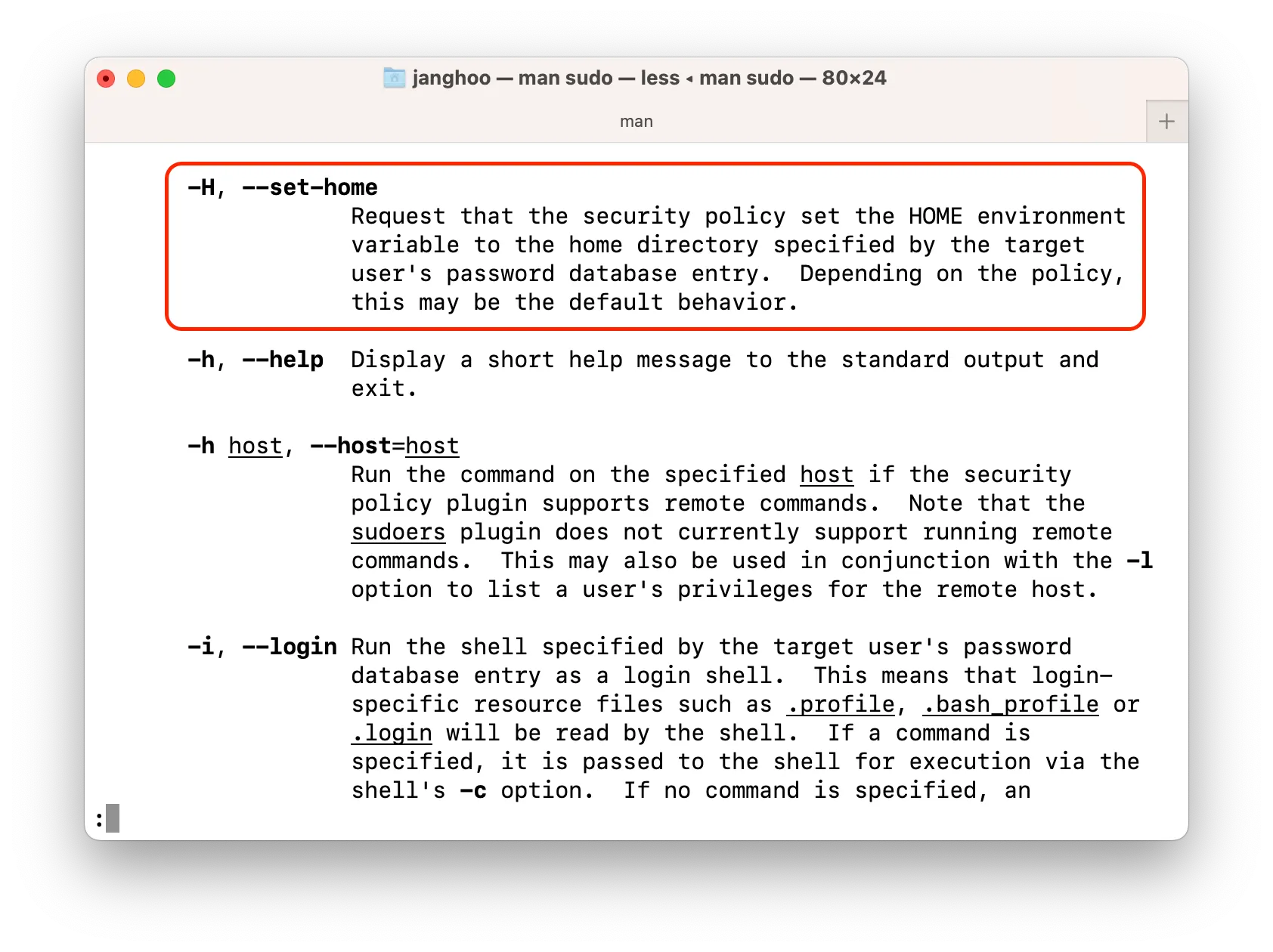 앞서 sudo만 입력한 경우를 언급했다. 해당 경우에는 $USER을 일시적으로 root로 바꿨다. 반면 sudo -H는 환경 변수 $HOME을 일시적으로 /home/root로 바꾼다.