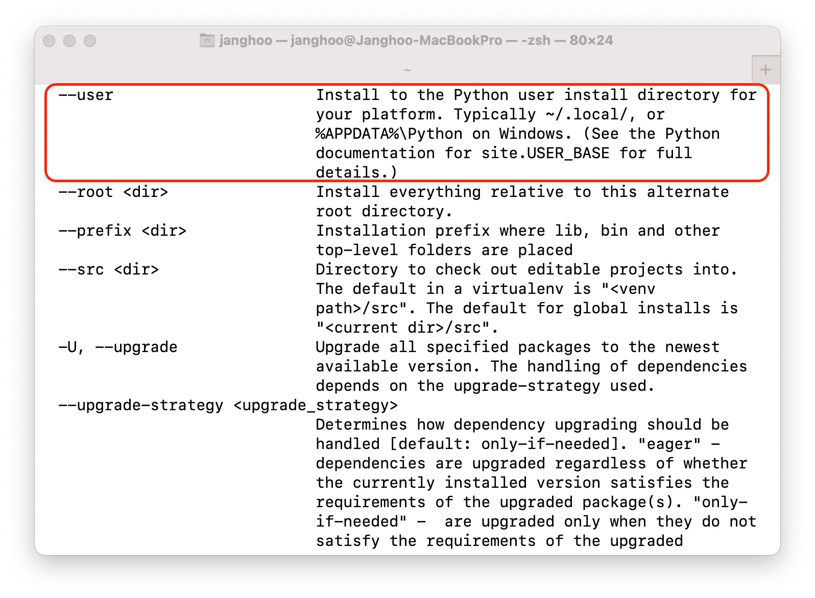 위에서 sudo가 포함된 설치 명령어의 본질에 대해서 알아보았으니 이제 만능의 도구 sudo를 모두 제쳐두고 --user 옵션에 대해서 알 필요가 있다. 몇몇 사람들은 sudo를 이용한 명령어는 위험하다며 다음 명령어를 사용할 것을 권한다.