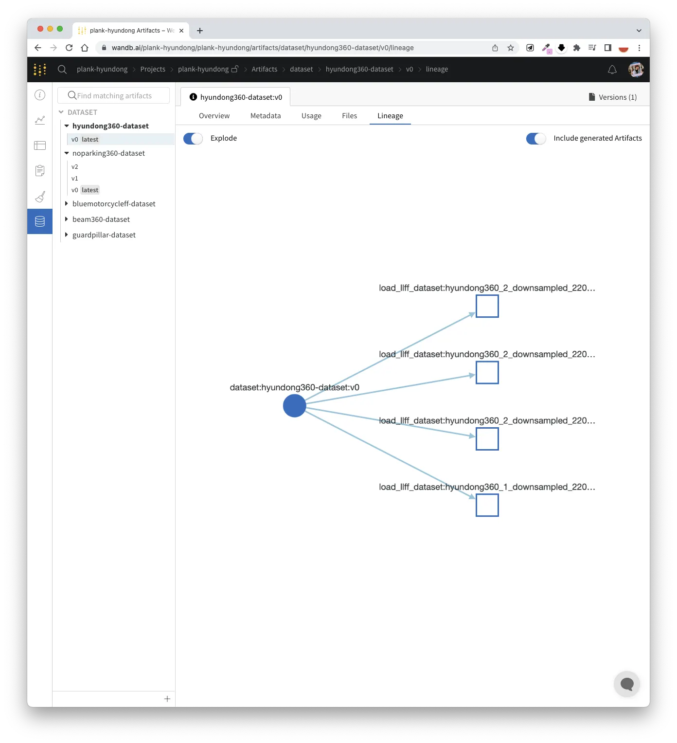 wandb(from1) 의 init 을 통해 모델 훈련 파이프라인을 생성할 수 있다. 파이프라인 조각(참고2,3)에 use_artifact 함수를 이용하여 파이프라인과 아티팩트(Artifact)(from2)간 의존 그래프를 정의할 수 있다(참고1). 모든 노드는 항구에서 흔히 볼 수 있는 획일적인 규격의 컨테이너처럼(from3) init 을 통해 생성되는 런(run)과 아티팩트만으로 구성된다. 아래 이미지를 보자. 푸른 동그라미는 아티팩트, 네모는 런을 의미한다. 이미지의 그래프를 보면, 하나의 데이터셋으로 네 번의 다른 실험을 진행했음을 직관적으로 알 수 있다. 당연히 아티팩트는 데이터셋만 포함할 수 있는것은 아니므로, 전처리 후처리 과정, 모델, 결과물 부스러기 등을 파이프라인에 포함시켜 그래프에 시각화하거나 불러올 수 있다(from2).