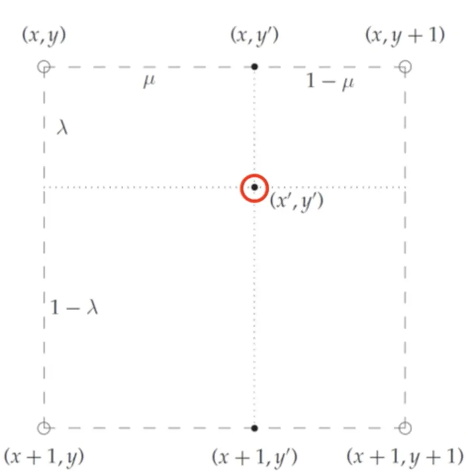 가로방향 선형보간을 거쳐 얻은 을 바탕으로 세로방향 보간을 통해 최종값을 만든다.