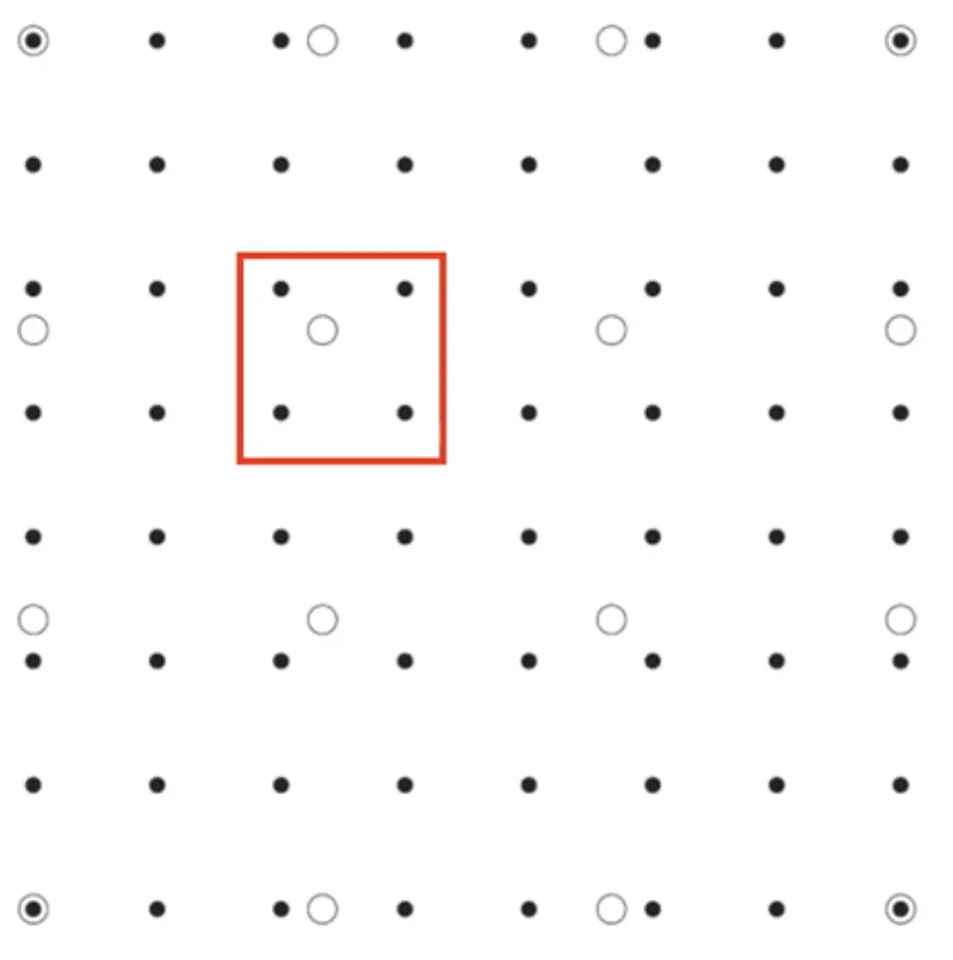 위 그림에서 흰 동그라미는 원래의 영상 (4x4) 이고, 검은 동그라미는 보간을 통해 만들어내고자 하는 영상 (8x8) 인 경우이다.