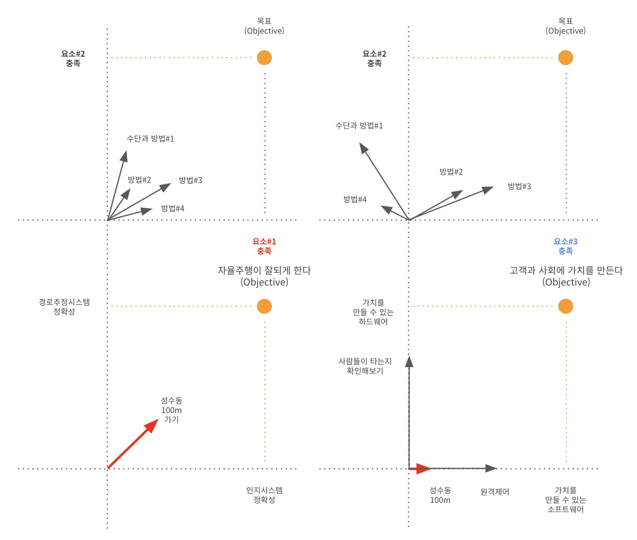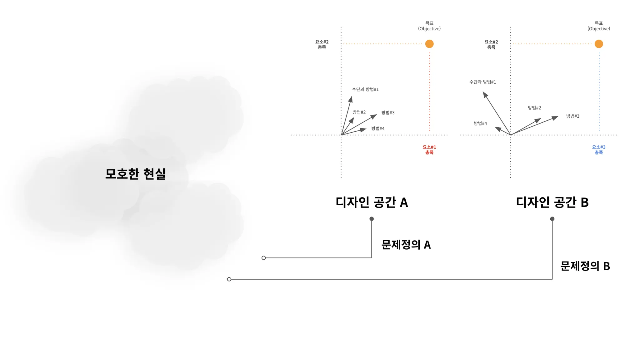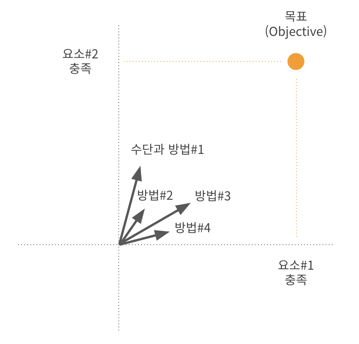 화살표가 시작하는 점은 현재 프로젝트의 상태야. 그리고 주황색은 목표야. 저 목표에 도달해서 해결해야 하는 몇 가지 결핍요소들이 있을거야. 저기에 도착하면 문제를 구성하는 요소들이 모두 해결이 되는 것이니까, 문제가 해결될 것이라고 할 수 있겠지? 우리의 상태에서 시작해서 저 주황색 목표 지점에 도달하기 위해서 다양한 화살표들을 사용할 수 있는데 이쪽 화살표가 맞다, 이쪽화살표가 맞다, 이 화살표가 한번에 길면 안된다 이렇게 서로 토의하는 것은 목표를 달성하기 위한 수단과 방법에 대한 토의를 하는거야.