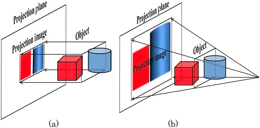 투영변환 먼저 살펴보자. 3D공간상의 물체를 2D로 투영하는 방식은 유일하지 않다. 대표적으로 잘 알려진 투영 방법은 두 가지로, 원근감을 반영하지 않은 직교투영(위 그림의 a)과 원근법을 적용한 원근투영(위 그림의 b)이다. 따라서 엄밀하게 따진다면 투영변환과 원근투영변환을 동급으로 두는 것은 옳지 않다. 투영변환은 직교투영변환과 원근투영변환을 모두 포함하기 때문이다. 하지만 대부분의 경우, 관습적으로 투영이라고 하면 원근투영을 떠올린다. 그래서 많은 사람들이 편하게 ‘원근투영변환’이라고 길게 쓰는 대신 ‘투영변환’이라고 쓴다(ref7). 하지만 이들을 잘 구분해두지 않으면 개념을 습득할 때 잔잔한 걸림돌이 된다. 이 글에서는 둘을 엄밀히 구분하기 위해 앞으로 원근변환과 원근투영변환이라는 표현을 구분해 사용하겠다.