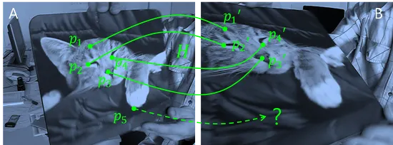 어느 위치에서 어느 방향으로 3D 물체를 바라보는지에 따라 그 모습이 달라진다는 사실을 모르는 사람은 없을 것이다. 카메라를 사용하는 경우도 마찬가지다. A, B는 같은 자세로 마우스패드를 잡고 있는 사람을 다른 위치와 다른 각도에서 촬영한 결과물이다. 과연 영상 A를 얻었을 때와 영상 B를 얻었을 각각의 경우 카메라는 어떻게 배치되어 있었을까? 이렇게 얻은 영상들의 형태는 다르지만 원래 동일한 피사체로부터 출발했다는 의미로 호모그래피(homography) 관계라고 불린다(ref4).