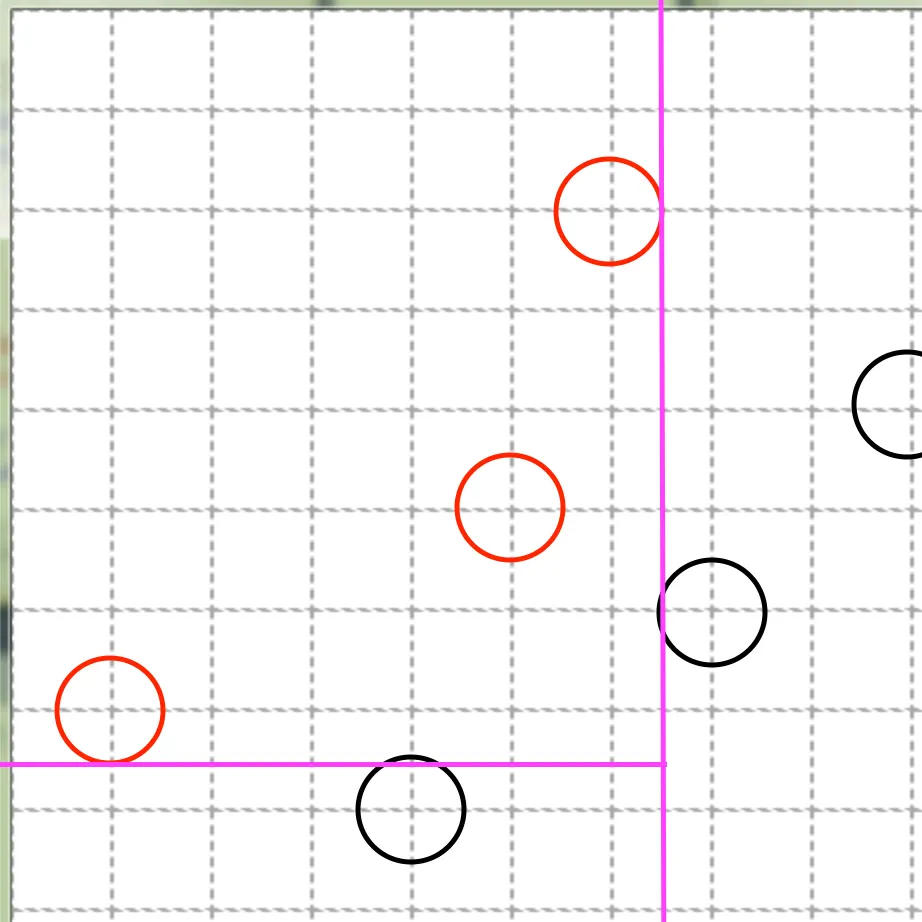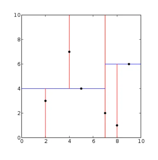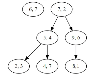 새로운 데이터 (6, 7)과 기존 데이터의 k-d tree를 바탕으로 다음을 구하라.