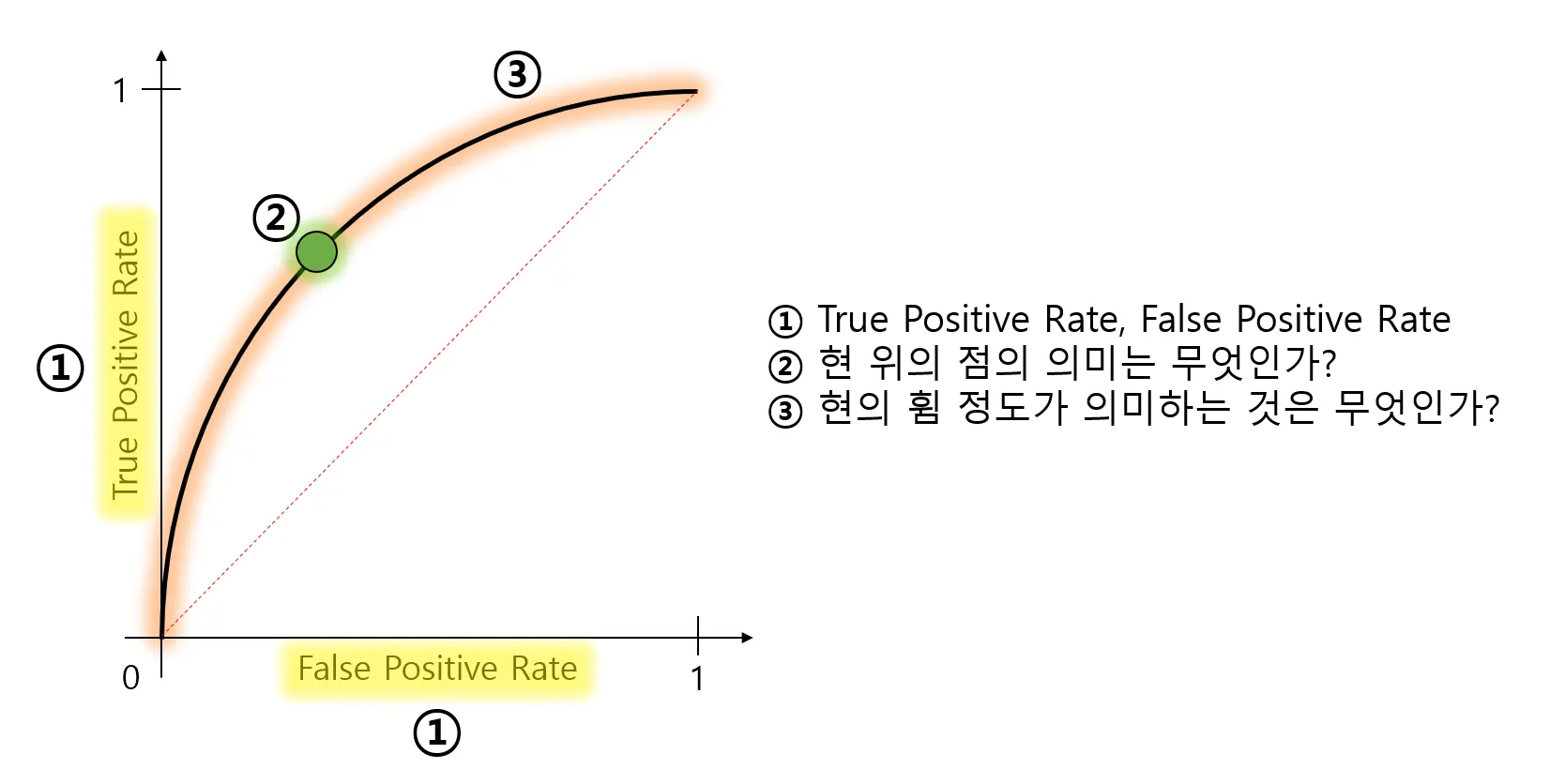 ROC curve의 현 위의 점의 의미는 무엇인가?