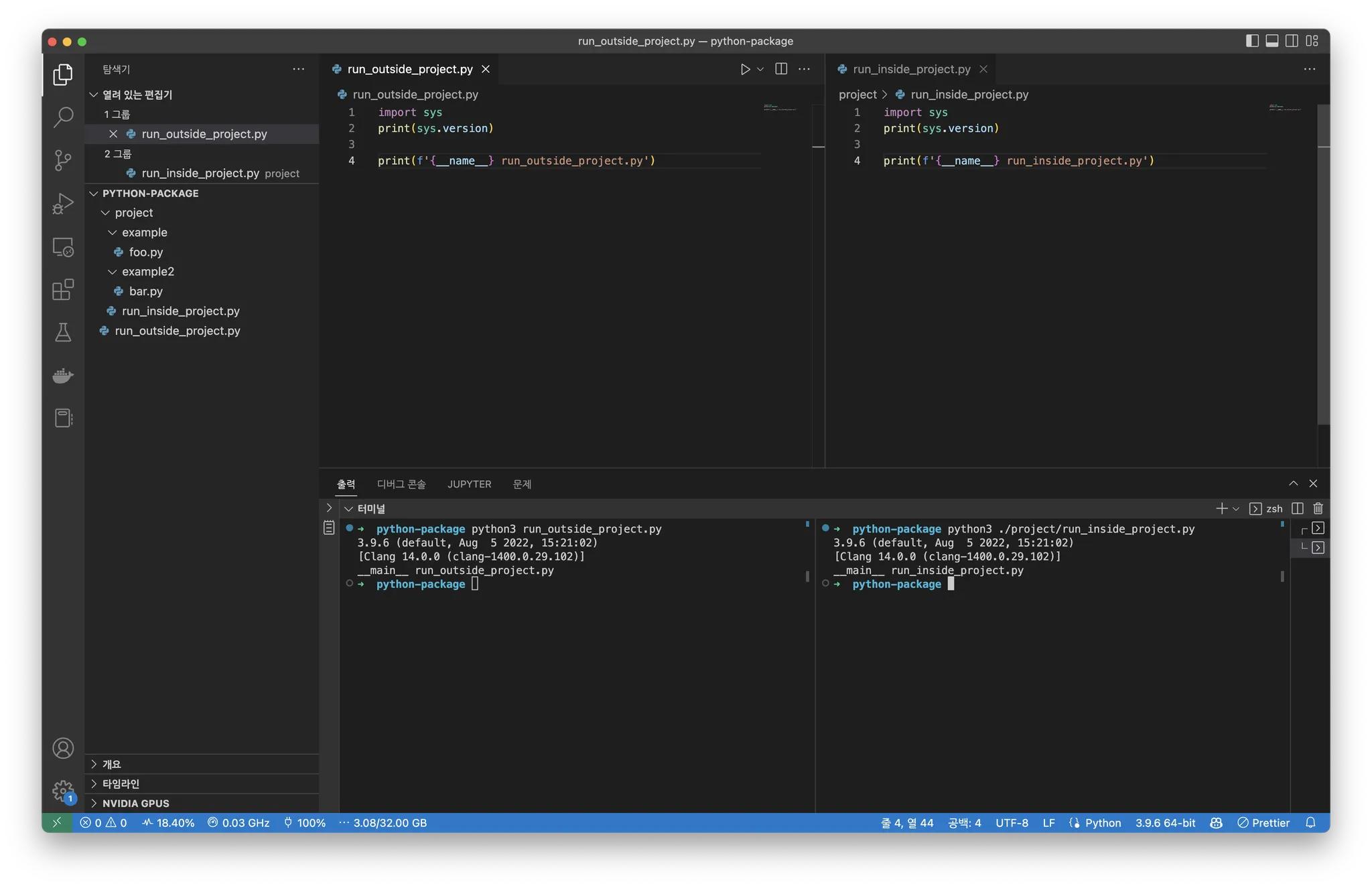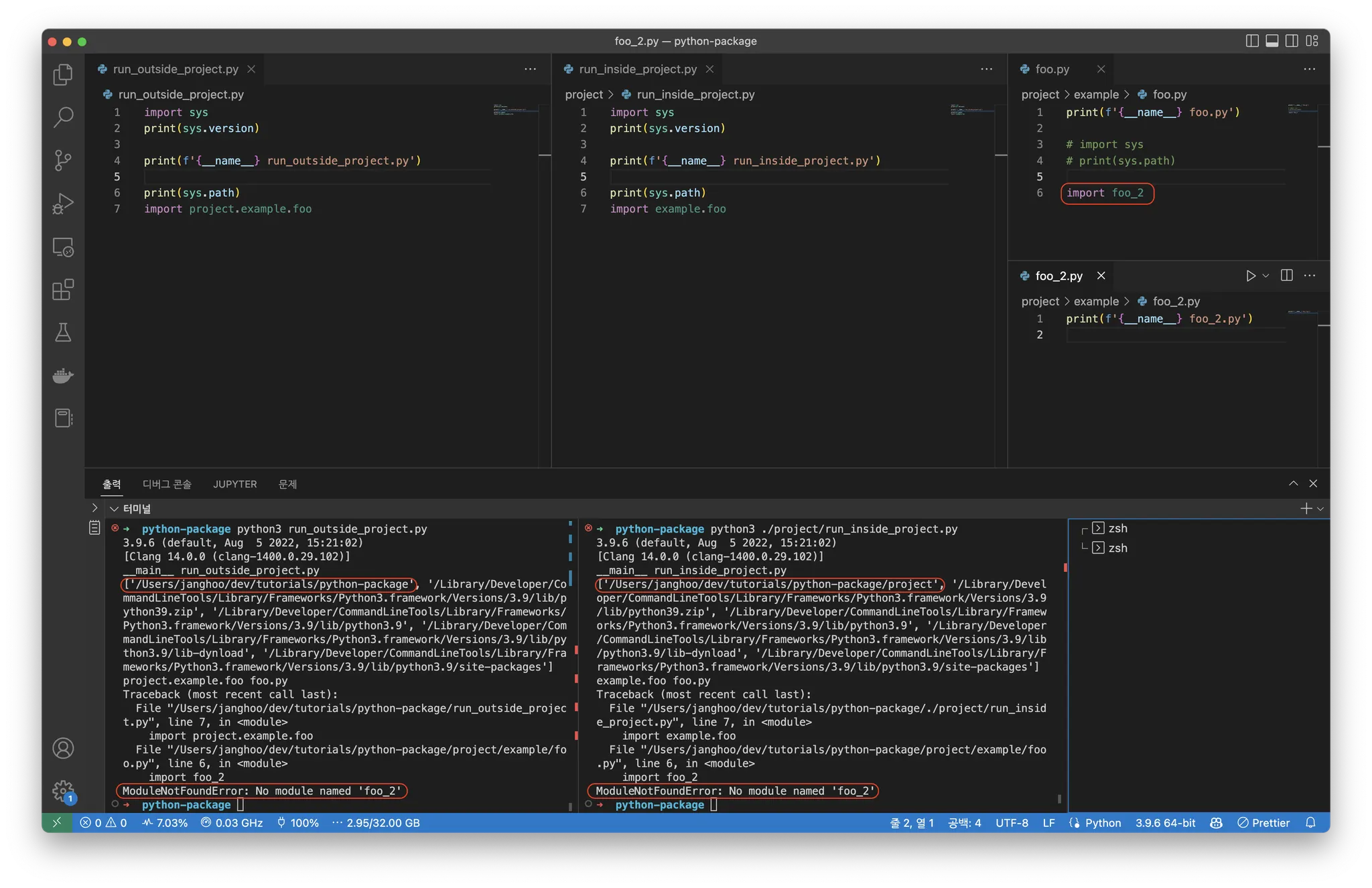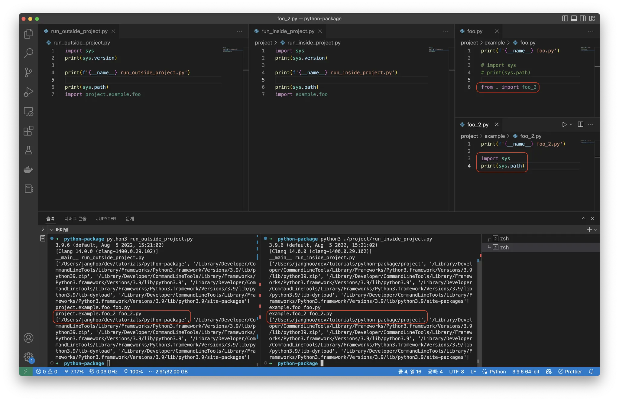 이럴 때 sys.path 와 상관없이 foo.py 파일이 존재하는 경로부터 다시 탐색을 시작하는 relative import 를 사용할 수 있다. foo.py 파일에서 from . import foo_2 를 이용하면 sys.path 이 변하지 않았지만 foo_2.py 파일이 정상적으로 임포트됨을 알 수 있다.