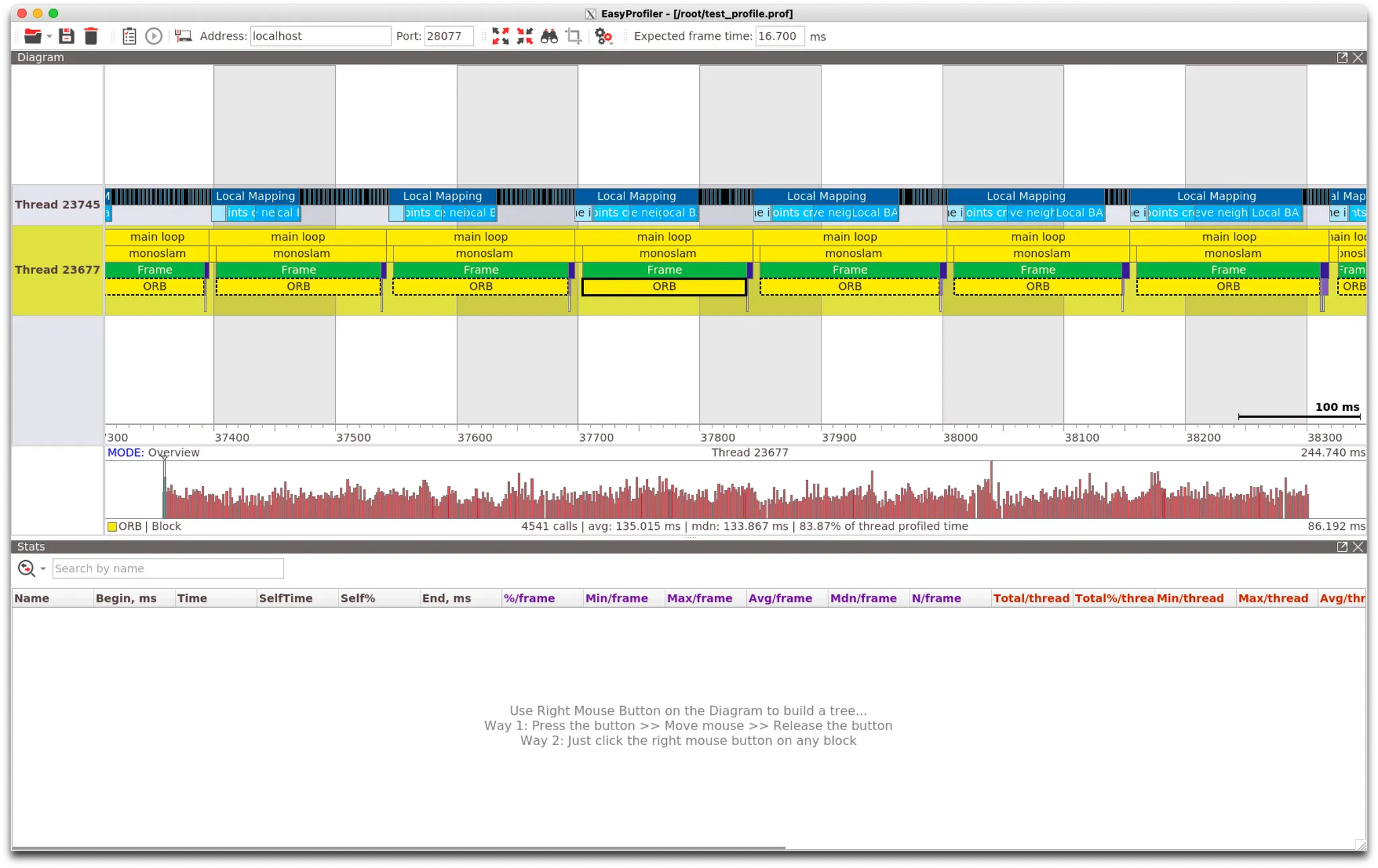 Profile ORB-SLAM2 with easy profiler. Docker env, host: Macbook Pro M1 2021