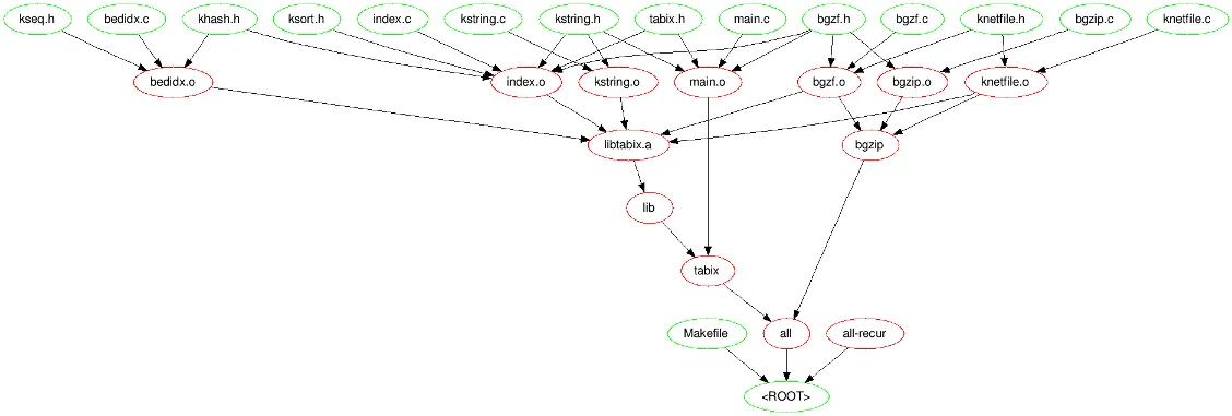 그림(참고1): 실제로 Makefile 이 그래프를 만드는지 아닌지는 모르겠지만, 의존관계를 정의한다는 것은 아래 그림처럼 상상해볼 수 있을 것이다.