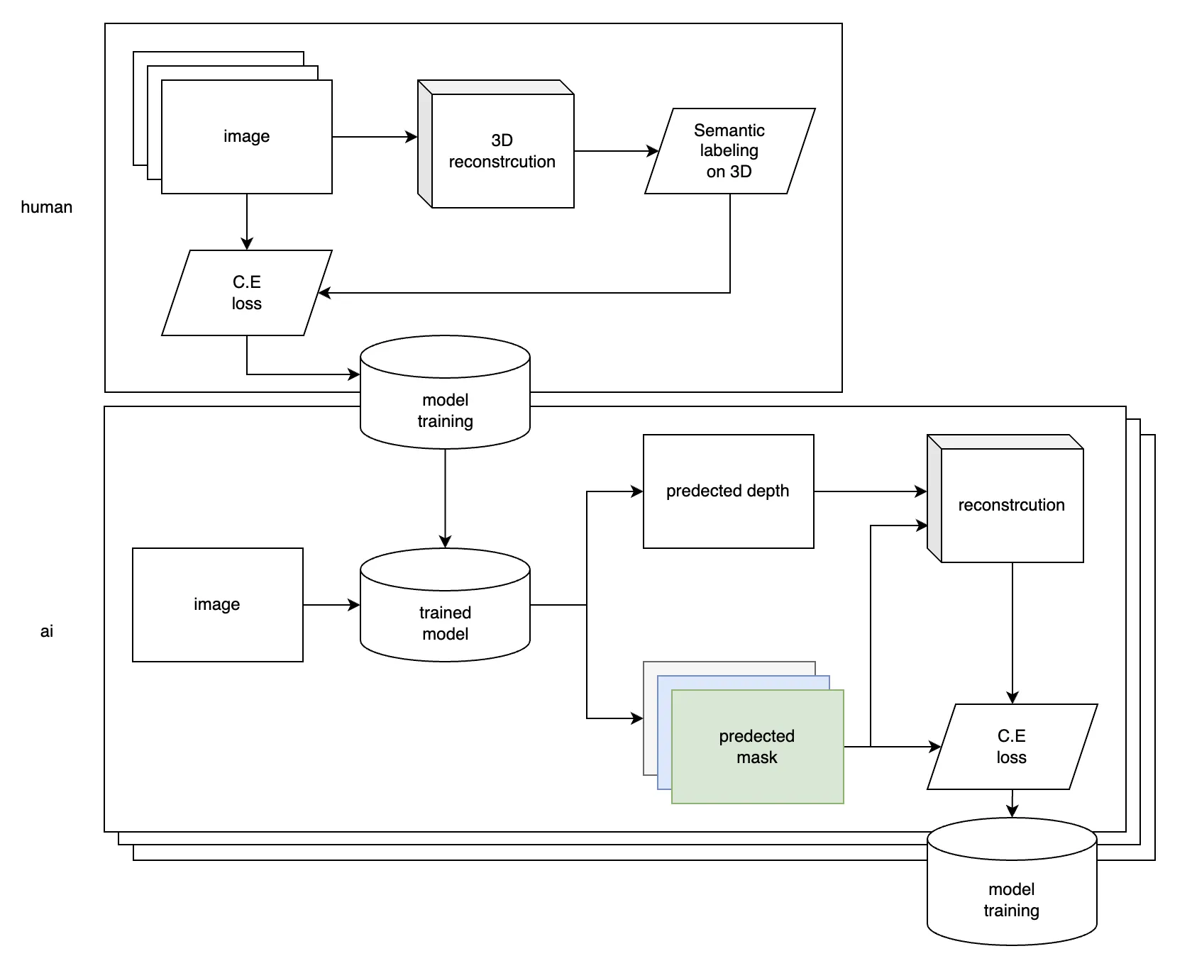 하지만, 이것도 사람과 컴퓨터 각각이 잘 하는 일을 하는 것이라고는 생각하지 않았고 (참고5) 오토 레이블링 파이프라인에 투자하기 시작했다. 사람은 어떤 씬을 보고 의미적으로 구분하는 것을 잘 한다. 하지만, 어떤 물체의 속력을 구하거나, 어떤 정적 구조물을 3D 로 복원해 내는 일을 매우 어려워한다 (참고 5, 12).
