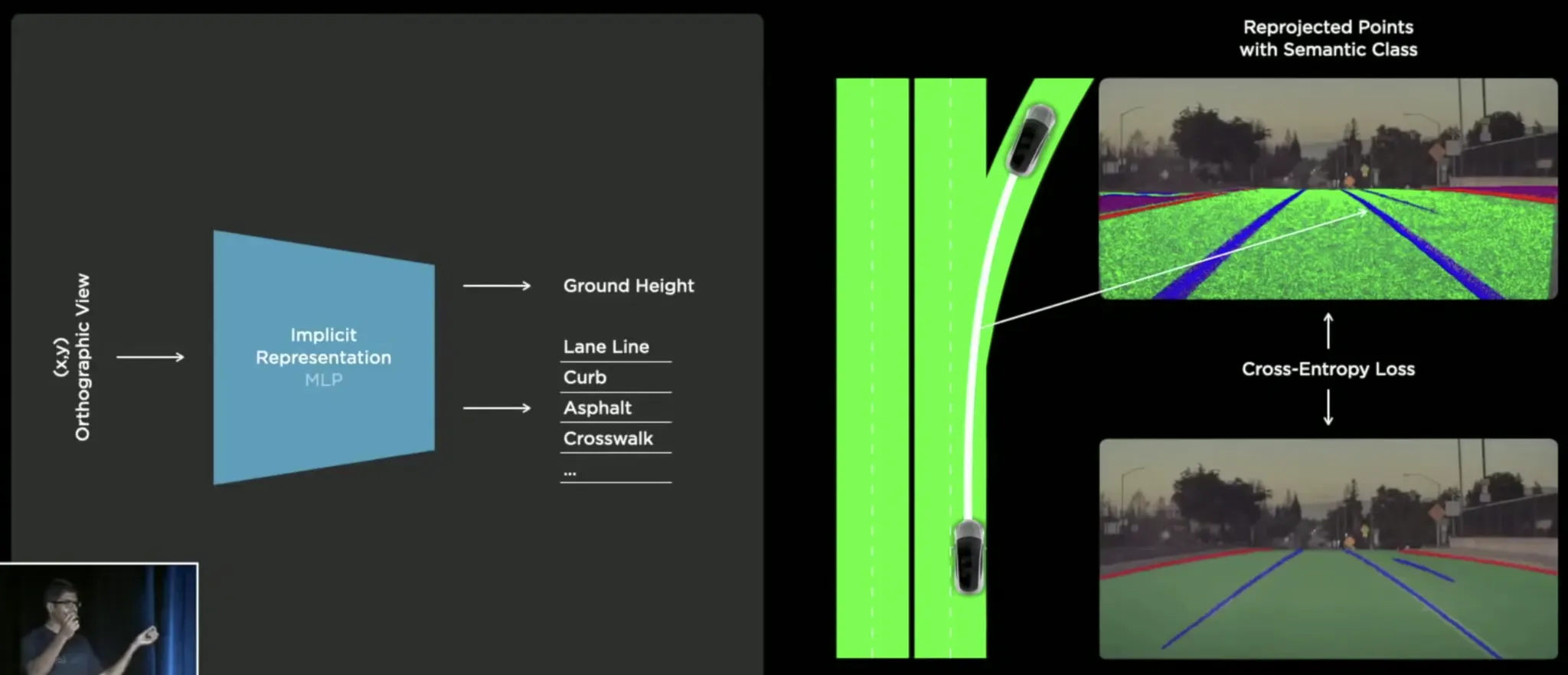 만약 도로를 레이블링해야 한다고 생각해 보자. 우리가 보통 도로를 레이블링한다고 하면, 어떤 2차원 평면에다가 n차 다항식으로 표현되는 선을 만들거나 segmentation mask 를 만들어내는 방식으로 레이블했을 것이다. 테슬라는 이것이 미분불가능하다는 문제가 있다는 것을 지적하며, 도로 표면을 neural radiance field 에서 제안한 대로 implicit representation 으로 표현한다 (참고7).
