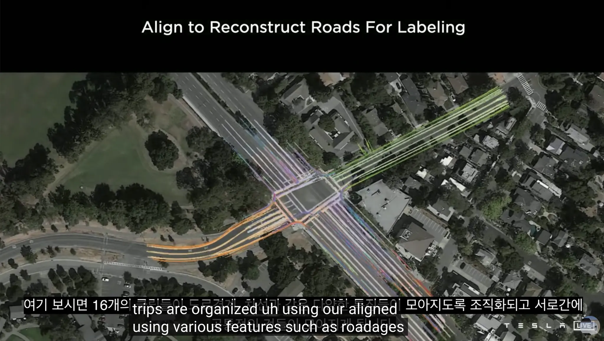 테슬라는 IMU, GPS, Odometry, multi camera 영상들이 모여 최대 45초의 비디오 클립과 데이터 집합을 서버로 전송한 뒤 가공하여 사용한다 (참고6). 2017년 초기 서드파티를 사용하던 것을 퀄리티와 속도상의 이슈로 중단하고 (참고1) 인하우스에서 엔지니어가 밀착하여 일반적인 기업처럼 2D 레이블링을 하는 체제로 전환했다 (참고2). 하지만 2D 평면에서 모든 프레임에 대해서 처리하는 레이블링은 비효율적이었고, 이를 3D 벡터 공간 (참고4:벡터공간) 에서 레이블링을 하여 자동으로 2D 평면으로 변환해 주는 체제로 변경하여 1000 배 이상의 레이블링 속도 향상을 만들었다 (참고3).