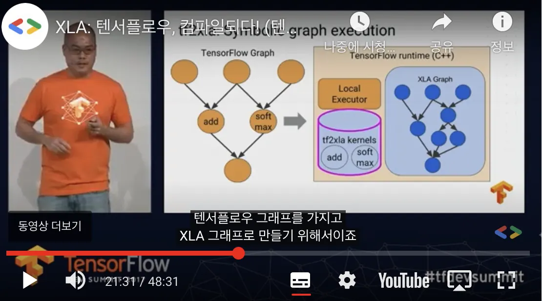 TensorFlow runtime 내의 원기둥은 tensorflow graph → XLA graph 가 가능하도록 준비된 연산들이다. 그림에서 add 는 1:1 대응되는 커널이고, softmax 는 1:3 대응되는 커널이라고 생각할 수 있다.