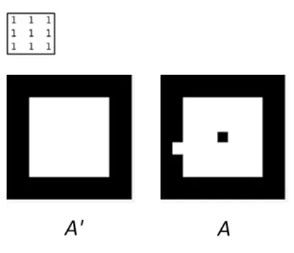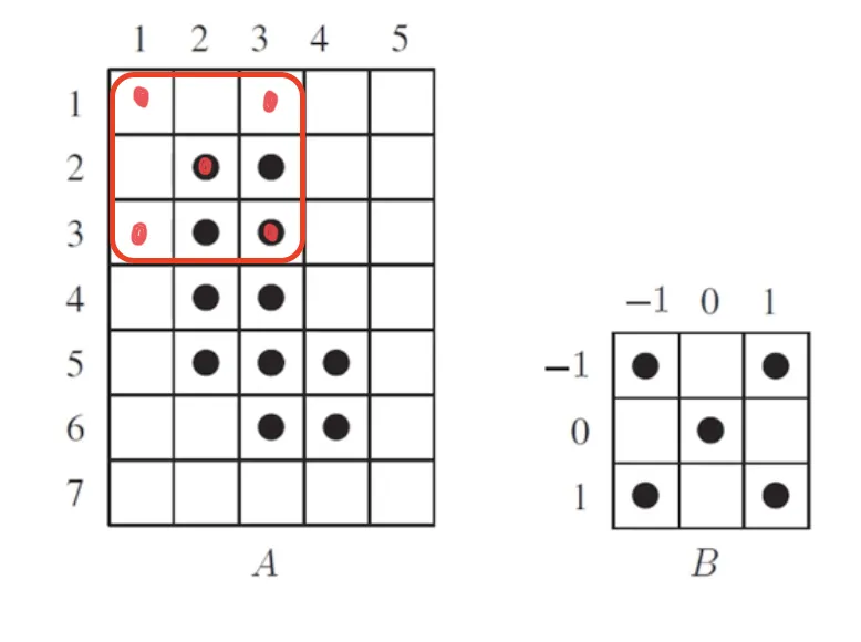 이것을 정확히 표현하면, "B 를 A에서 이동하며, B 가 A 의 내부에 완전히 속할 때에 B 의 원점 (0,0) 위치에 1 을 표기한다." 가 된다.