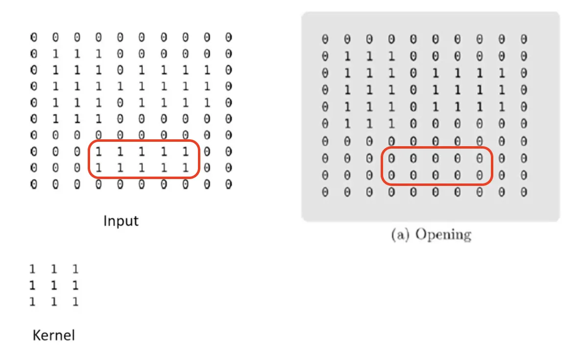 열림 연산은 0 의 위치의 1 의 잡음을 제거하는 데에 효과적일 수 있다.