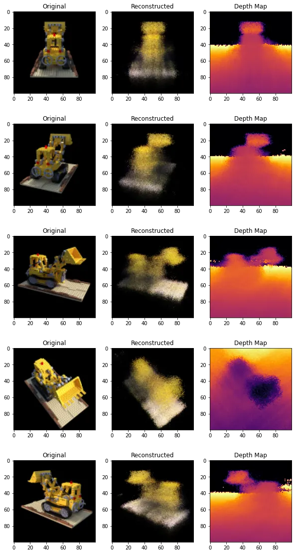 Here we see the training step. With the decreasing loss, the rendered image and the depth maps are getting better. In your local system, you will see the training.gif file generated.
