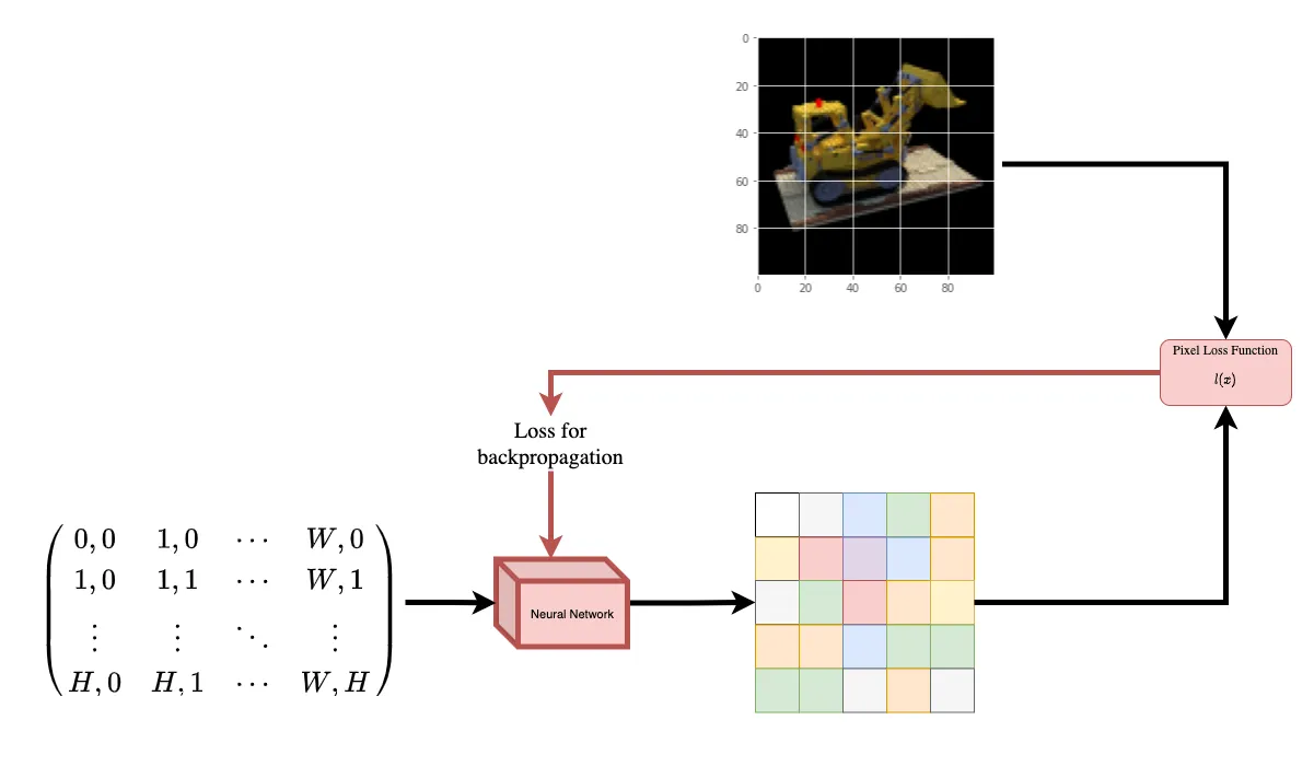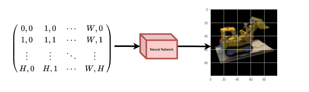 To help you understand this intuitively, let's start with the following question: would it be possible to give to a neural network the position of a pixel in an image, and ask the network to predict the color at that position?