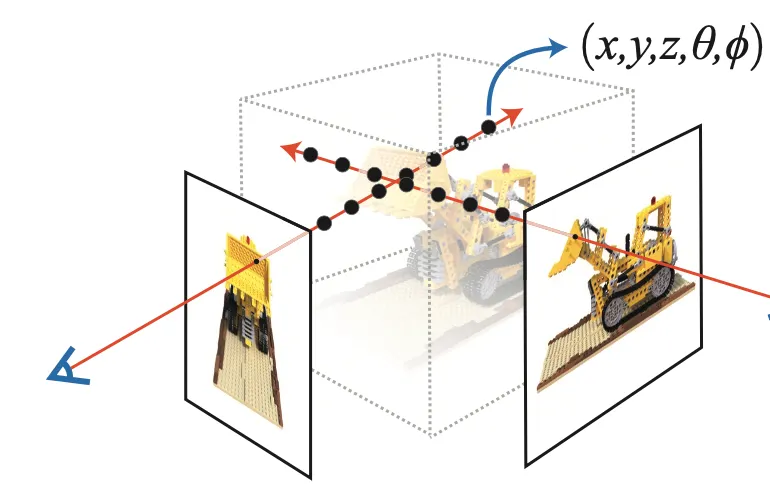 Figure 8 showcases the entire sampling process in 3D, where you can see the rays coming out of the white image. This means that each pixel will have its corresponding rays and each ray will be sampled at distinct points.
