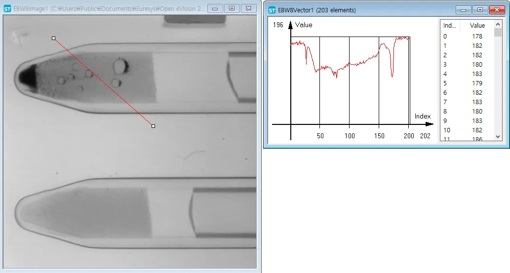 영상에서 특정 경로상에 있는 픽셀의 밝기값을 그래프 형태로 표현한 것을 프로파일(profile)이라고 한다. 프로파일을 이용해 영상의 노이즈를 분석하기도 한다.