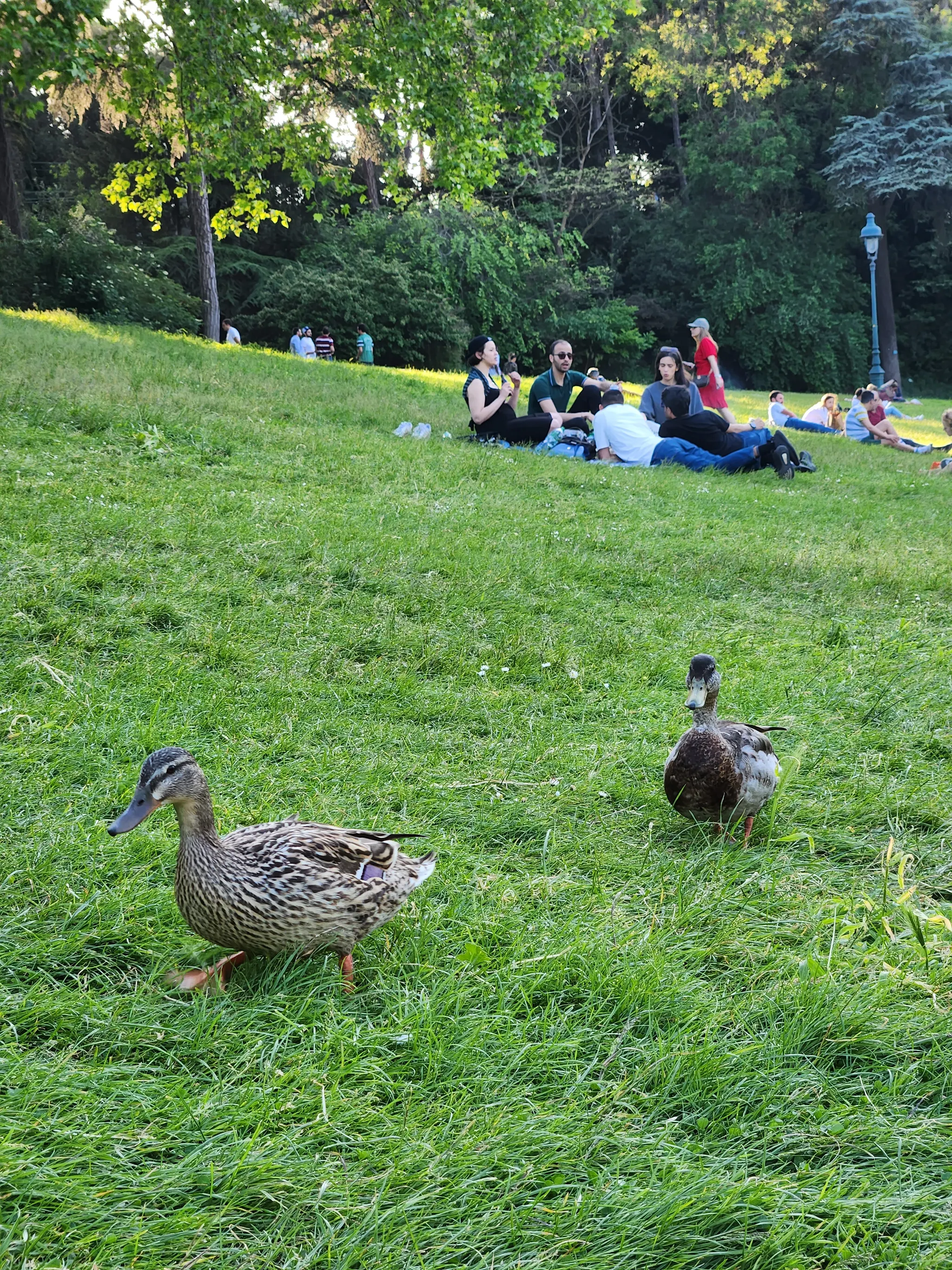 공원에 여유롭게 돌아다니는 오리들과 그 뒤로 보이는 사람들