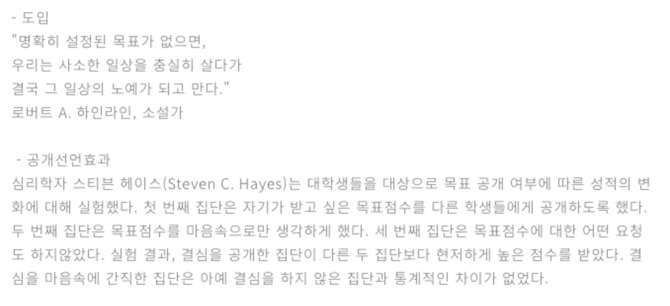 공개 선언 효과 : 나의 목표를 다른 사람들에게 알릴수록, 실행 가능성이 높아진다.