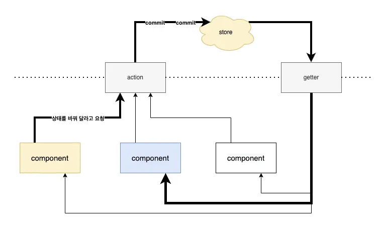 플럭스 패턴에서는 컴포넌트에서 다른 컴포넌트로 데이터를 갱신해 보내고 싶을 때에는 반드시 액션(Action)을 사용해서 중앙 저장소에 있는 값을 변경하도록 강제하도록 했다. 액션을 사용하면 변경사항이 커밋된다고 표현한다. 이는 라이브러리단에서 변경이 추적되고 있음을 내포한다(참고9:정확히는 action이 아니라 mutation 이라는 단계가 포함되어 있지만, pinia 같은 경우에는 mutation 없이 action만으로도 추적한다. 본질은 action이라는 통일된 API 를 사용함으로써 추적 가능성을 확보한 것이다). 다른 컴포넌트에서는 미리 정의되어 있는 getter 메서드를 사용하도록 했다.