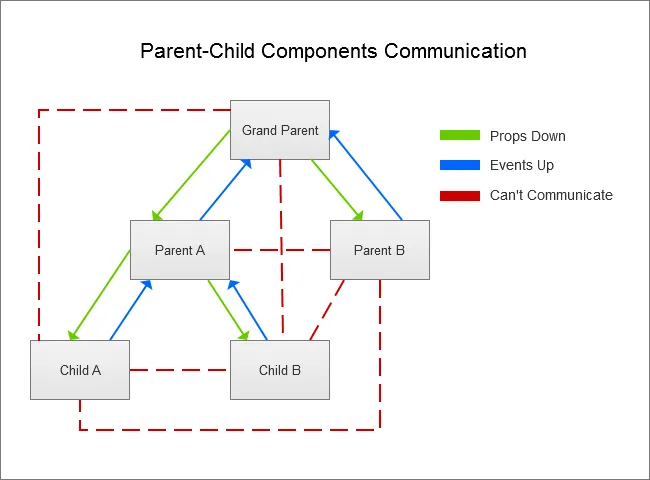 컴포넌트 단위로 웹 페이지를 만들어나가는 뷰(Vue)(from2)나 리액트(React)(from3)같은 프레임워크들에서는 상위 프로퍼티와 하위 프로퍼티가 트리식으로 정리된다. 이렇게 트리식으로 정리된다는 이야기는 프로퍼티 내려꽂기(Props drilling) 문제(참고1)가 발생하기 쉽다는 것을 의미한다.