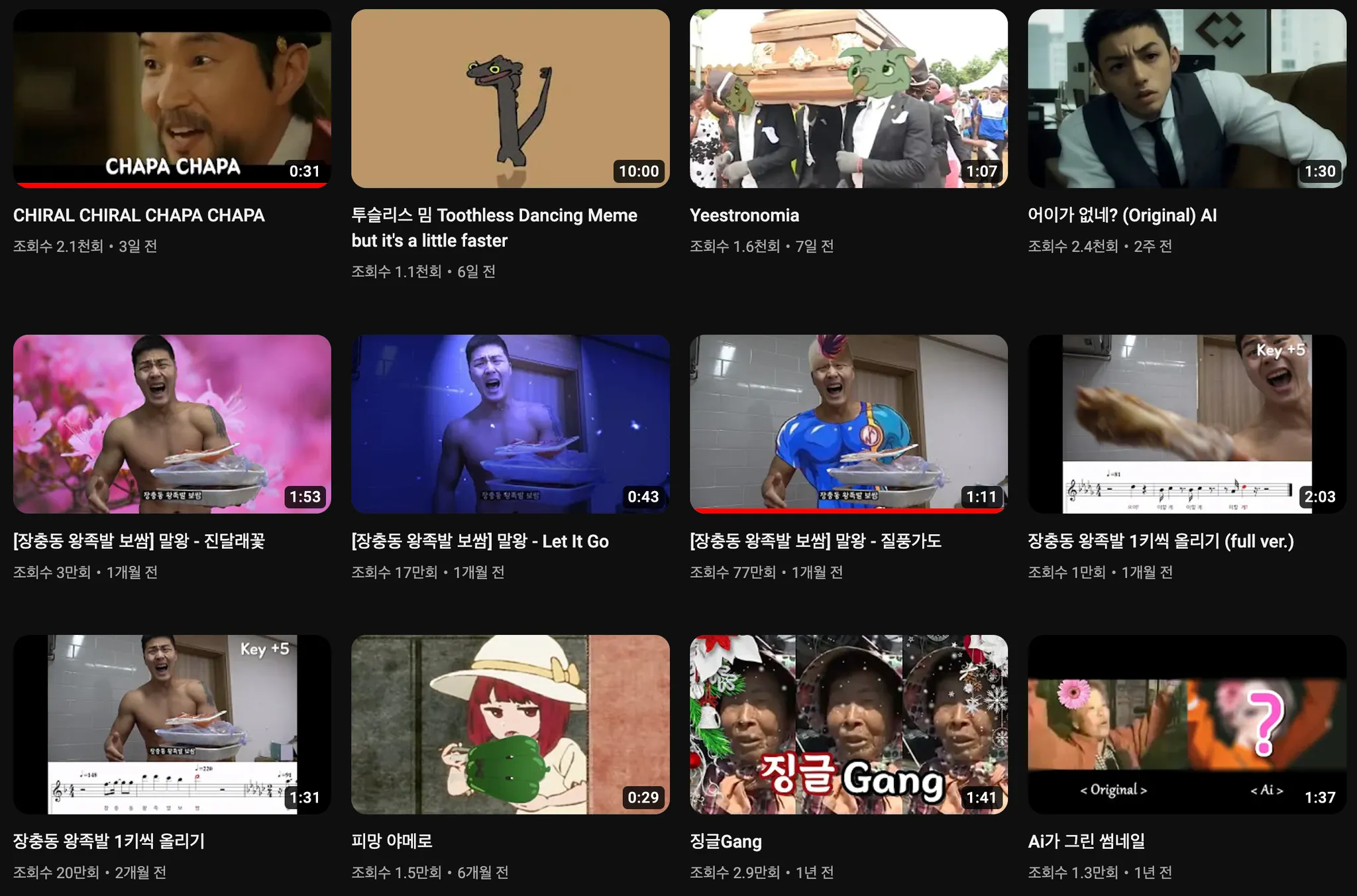 10만 구독자를 가진 ‘치이유’의 사례는 ‘개인발 N’의 좋은 예다. 지금으로부터 1~2달 전까지 한창 말왕의 ‘장충동 왕족발 보쌈’ 이 유행했었다. 이 사람은 누구나 알만한 밈을 가지고 노는 사람임에도 불구하고, 트래픽이 유행하는 시기에 맞추어 업로드된 동영상에 대해 사람들의 유입이 압도적으로 많아 재탕 삼탕을 하고 있다는 것을 알 수 있다.