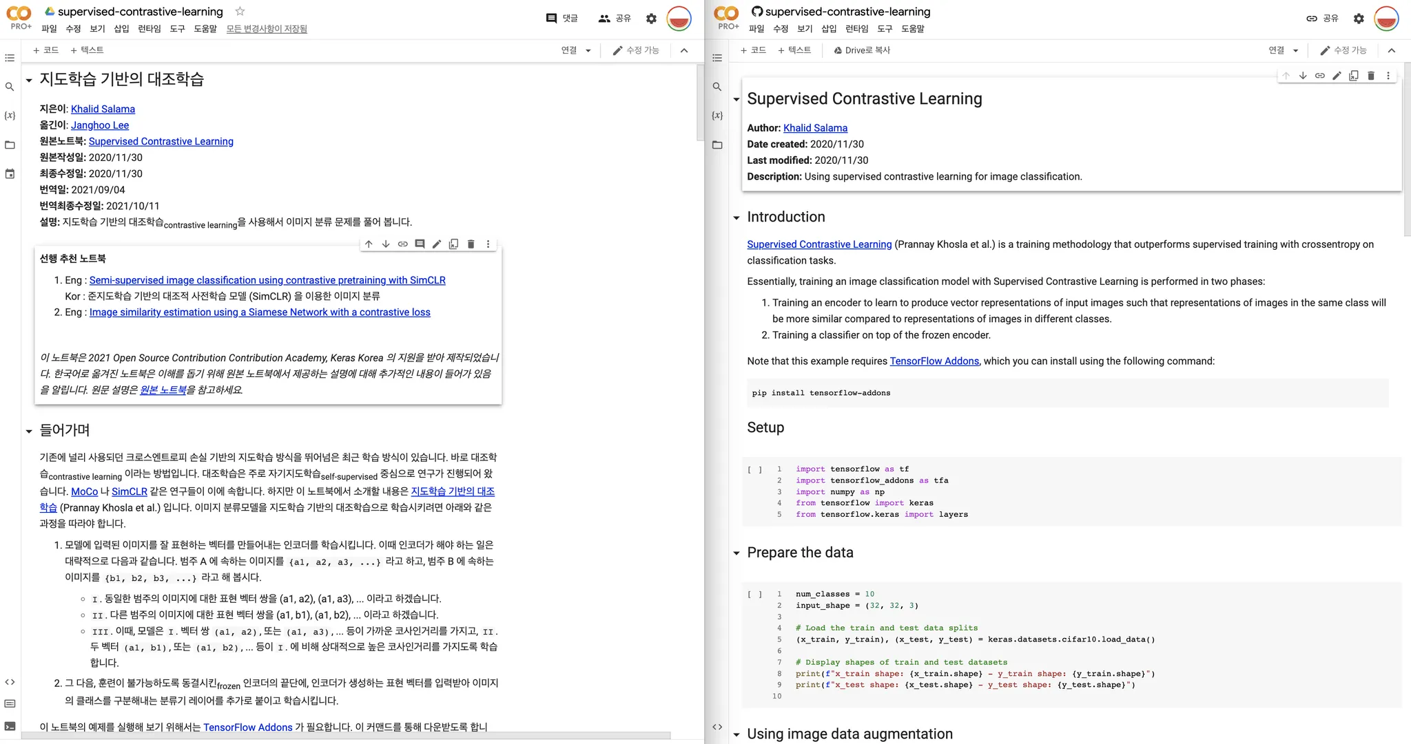케라스의 공식 예제들은 제가 딥러닝을 처음 공부할 때 많은 도움이 되었습니다. 처음에는 MNIST 수준의 예제밖에 없었지만, 다양한 분야의 예제들이 빠른 속도로 추가되었습니다. 이에 비해 번역 속도는 예제의 출시속도를 따라가지 못했습니다. 번역 작업을 위해 사람들이 모였습니다. 하지만 번역 후보 노트북 목록에 있는 많은 주제들 중에서 대조학습을 번역하시려는 분들은 많이 없었습니다. 어려운 주제라고 해서 영어로 공부해야만 할 필요는 없습니다.