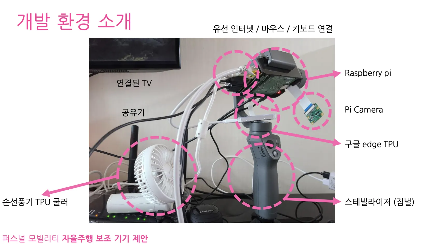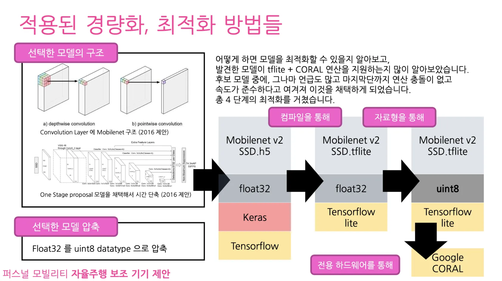 컴퓨팅 리소스 문제를 해결하기 위해서는 경량 모델을 선택하고, 이것을 한번 더 양자화한 뒤, Google CORAL Edge TPU라는 USB형 하드웨어 가속기를 사용했습니다. 당시에는 양자화 API 및 CORAL의 자료가 풍부하지 않아 공식 메뉴얼을 전부 읽으며 시스템을 구성해야만 했습니다.