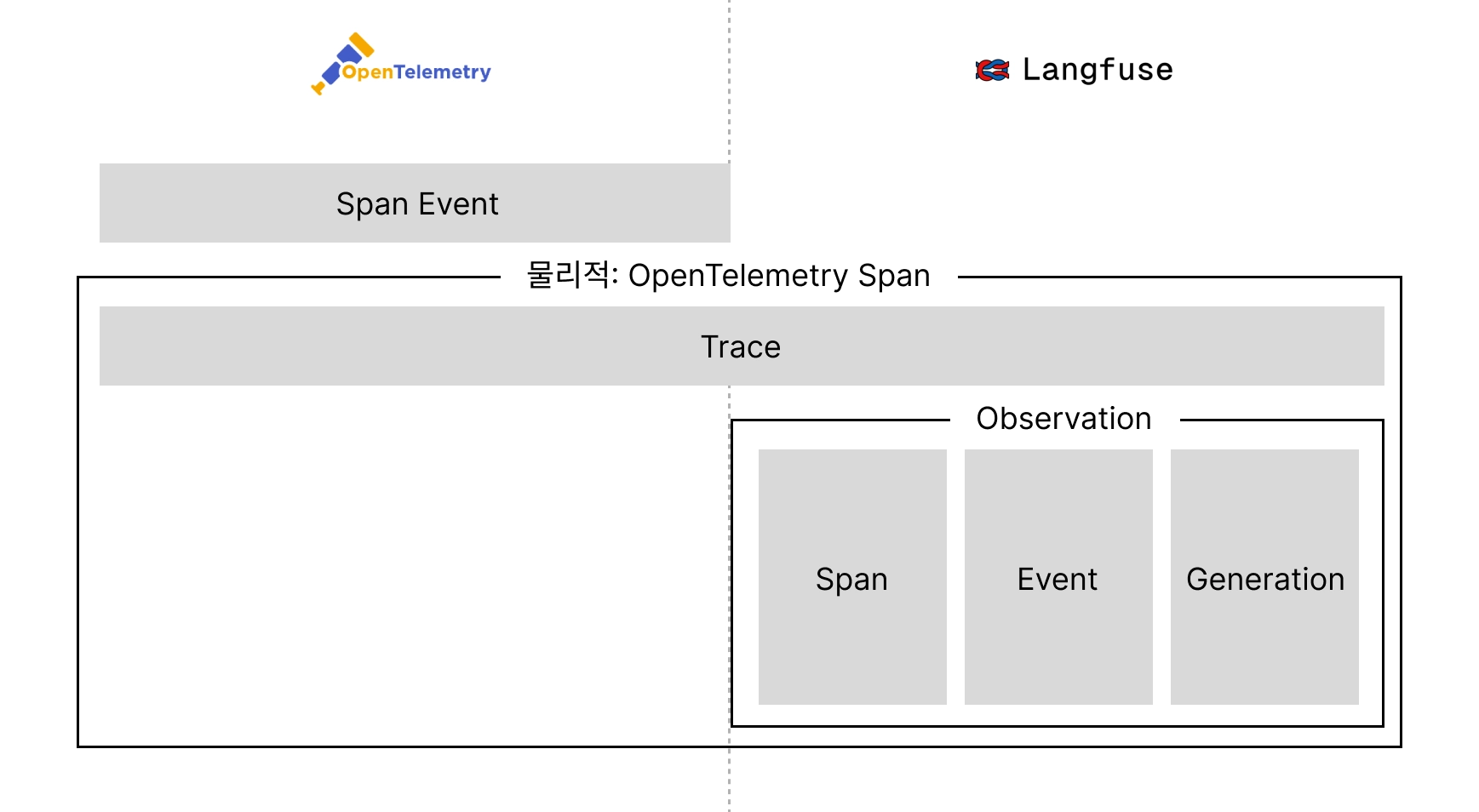 Trace이외에도 Langfuse문서에서 등장하는 트레이스, 스팬같은 용어가 등장합니다. 이것들은 Otel이 정한 데이터 구조(Protocol)입니다. Langfuse가 만든 말이 아닙니다. 단, 생성이나 이벤트는 Langfuse 용어입니다. Otel은 세상의 모든 작업을 그냥 스팬이라고 부릅니다.