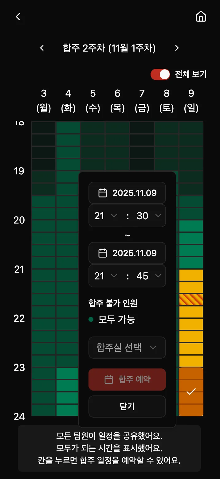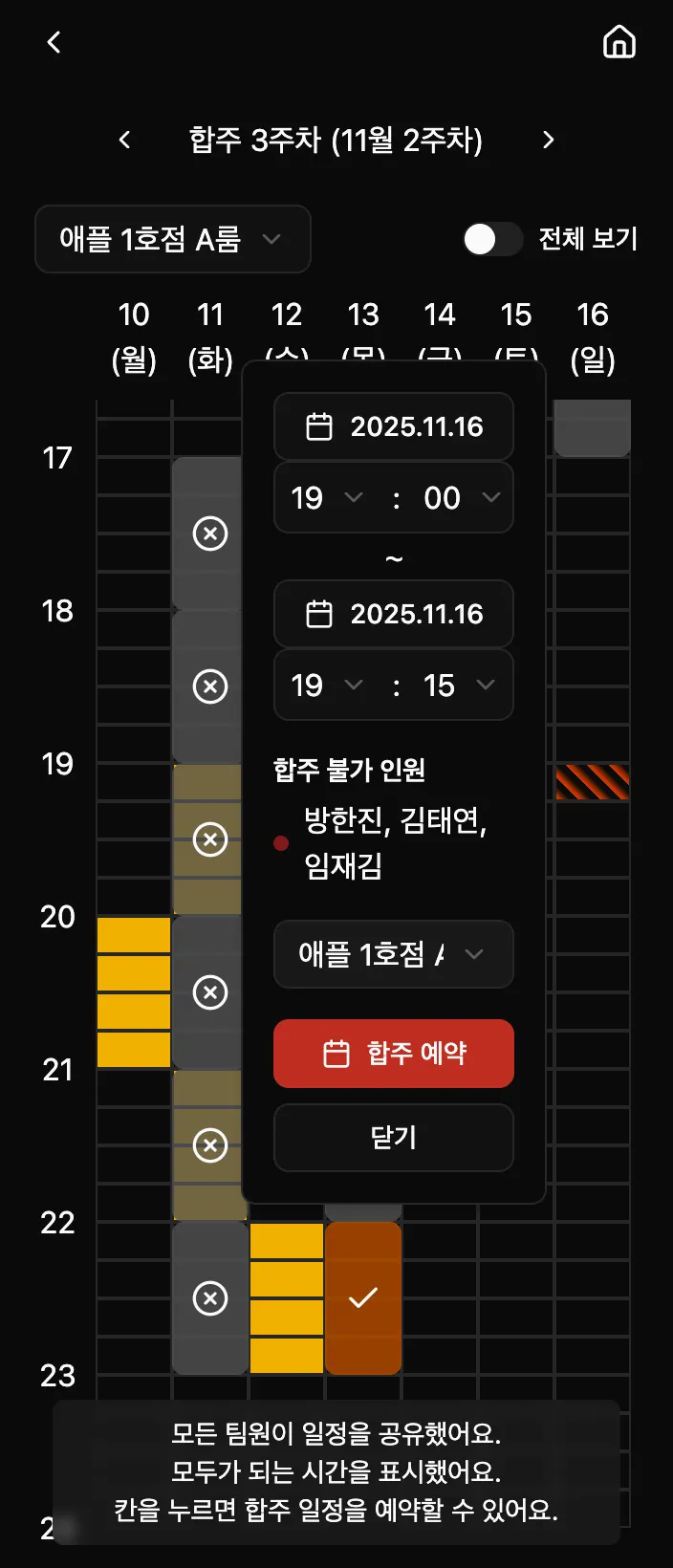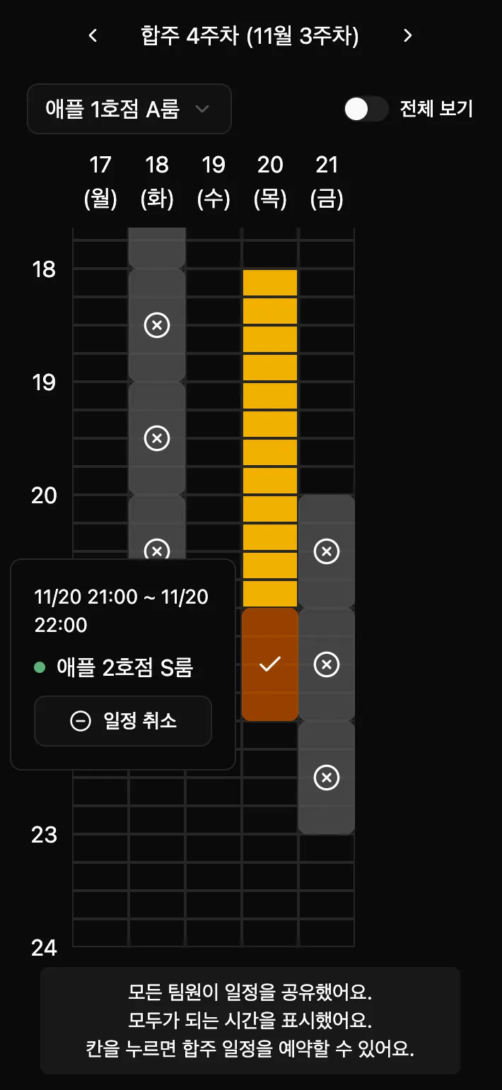 우리는 튜닝에서 밴드동아리 합주팀을 구성하는 모든 사람들의 일정, 합주실의 일정을 한눈에 파악하고 예약까지 원클릭으로 가능하도록 만들었습니다. 내가 여러 개의 합주팀에 속해 있을 때, 한 개의 합주팀에서 합주실과 합주 일정을 확정하면, 해당 합주실을 사용하려는 모든 사람들에게, 내가 속한 모든 합주팀에 해당 정보가 전파됩니다. 화면을 구성하는 모든 요소들이 수다쟁이 고객들의 귀따가운 피드백을 바탕으로 다듬어졌기 때문에 그 완성도가 더 만족스러운 것 같습니다. 바이브 코딩으로 딸깍거려 만들 수 있는 수준을 압도적으로 넘어섰다고 생각합니다.