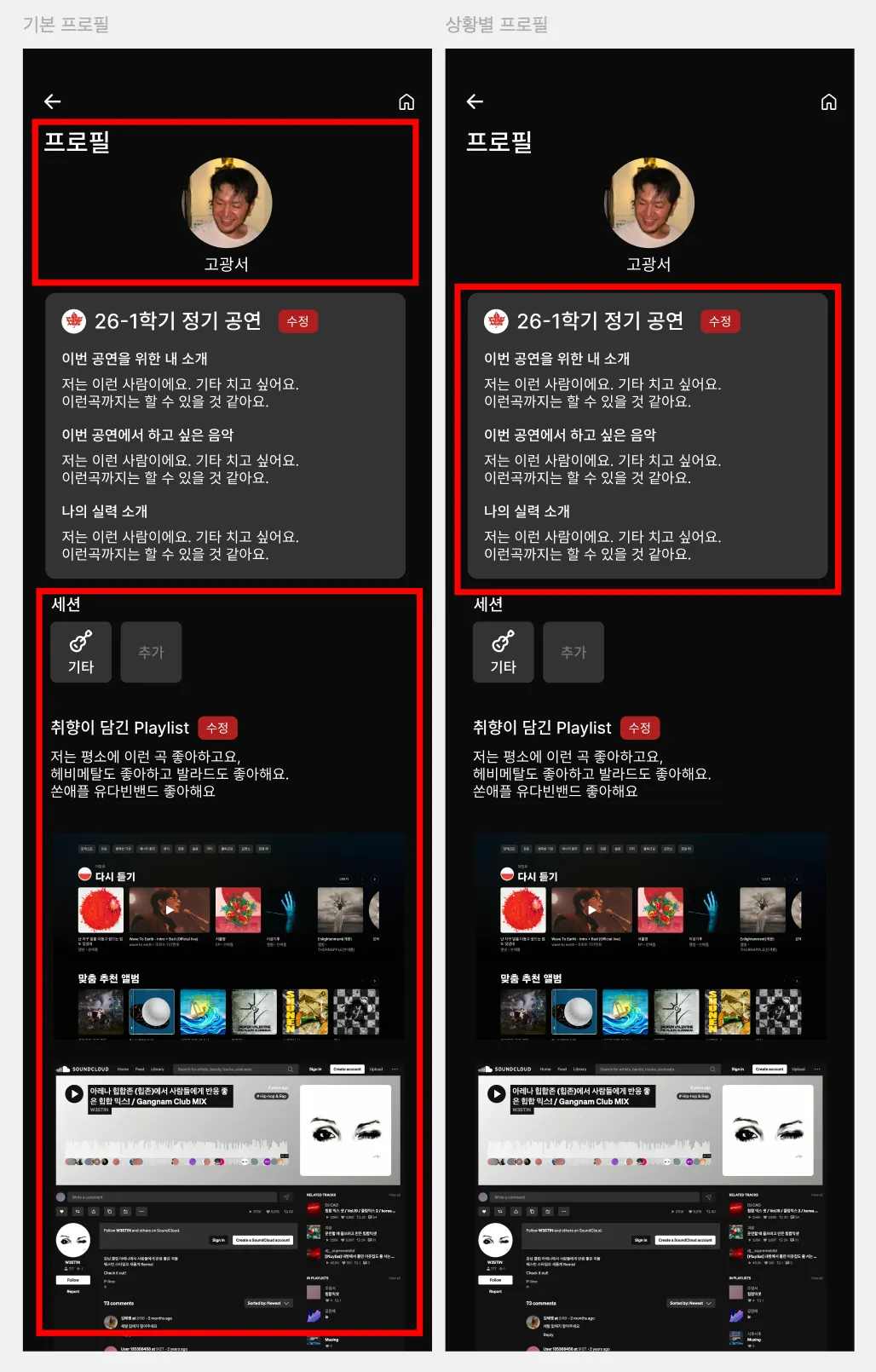 이쯤 잠깐 ‘프로필’을 계층적으로 바라보는 제 관점을 공유드립니다. 제 생각에 프로필은 총 두 개의 계층으로 구성됩니다. 아래에는 ‘기본 프로필’ 레이어가 깔리고, 그 위에는 ‘상황별 프로필’ 레이어가 올라갑니다. 기본 프로필 레이어에는 플레이리스트나 좋아하는 아티스트와 같은 취향 정보, 닉네임 또는 이름, 세션과 실력, 프로필 사진, 아직 구현까진 먼 미래이지만 업적 등을 포함합니다. 그렇다면 ‘상황별 프로필’ 레이어는 뭘까요? 우리는 팀 빌딩 방식으로 공연을 구성하는 동아리들의 흐름을 모델링하며, ‘요리보고 조리보’기 위해서는 기본 프로필 존재에도 불구하고 공연 맥락의 프로필이 필요하다는 것을 파악했습니다. 즉, ‘상황별 프로필’ 레이어는 특히 ‘이 공연’에서 하고 싶은 곡 또는 ‘이 공연’에서 맡고 싶은 세션을 포함합니다. ‘이번 공연’ 상황 속의 나와 ‘음악인으로서의 나’는 조금 다른 정체성을 가집니다. 상황별 프로필과 기본 프로필은 이러한 프로필의 특징을 추상화한 것입니다.