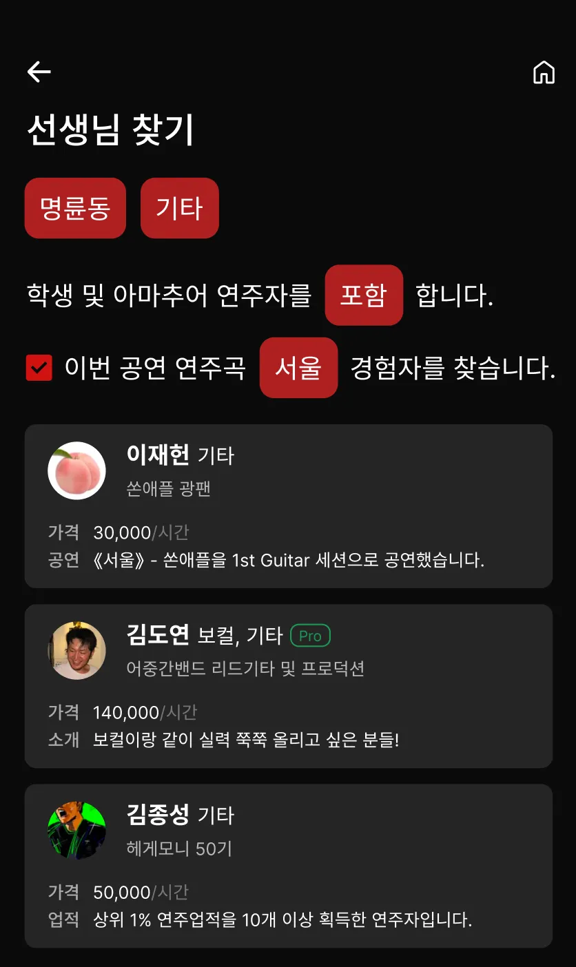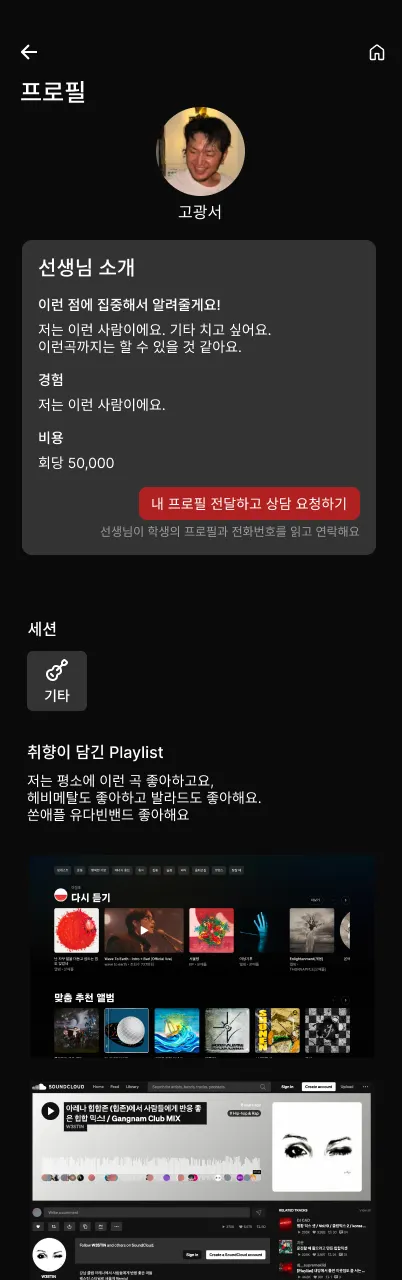 악기 과외 선생님과 학생을 매칭하기 위해서는 학생 정보와 선생님의 정보가 필요합니다. 앞서 프로필을 이야기한 이유는 학생 정보와 선생님 정보랄 것이 결국 기본 프로필과 상황별 프로필을 채워 넣는 것과 동일하기 때문입니다. 새로운 화면이나 새로운 데이터구조 없이도 학생의 프로필이 학생을 충분히 설명하고 선생님의 프로필이 별도의 상세 페이지 없이도 선생님을 설명하는 역할을 수행하게 만들 수 있어 개발 공수가 적게 드는 시도이기도 합니다.