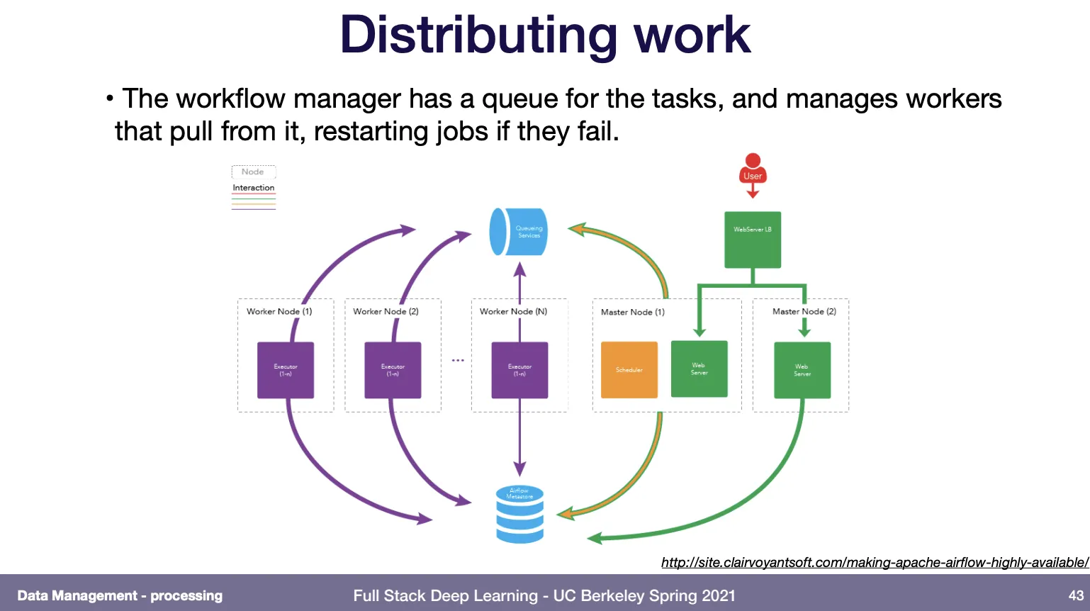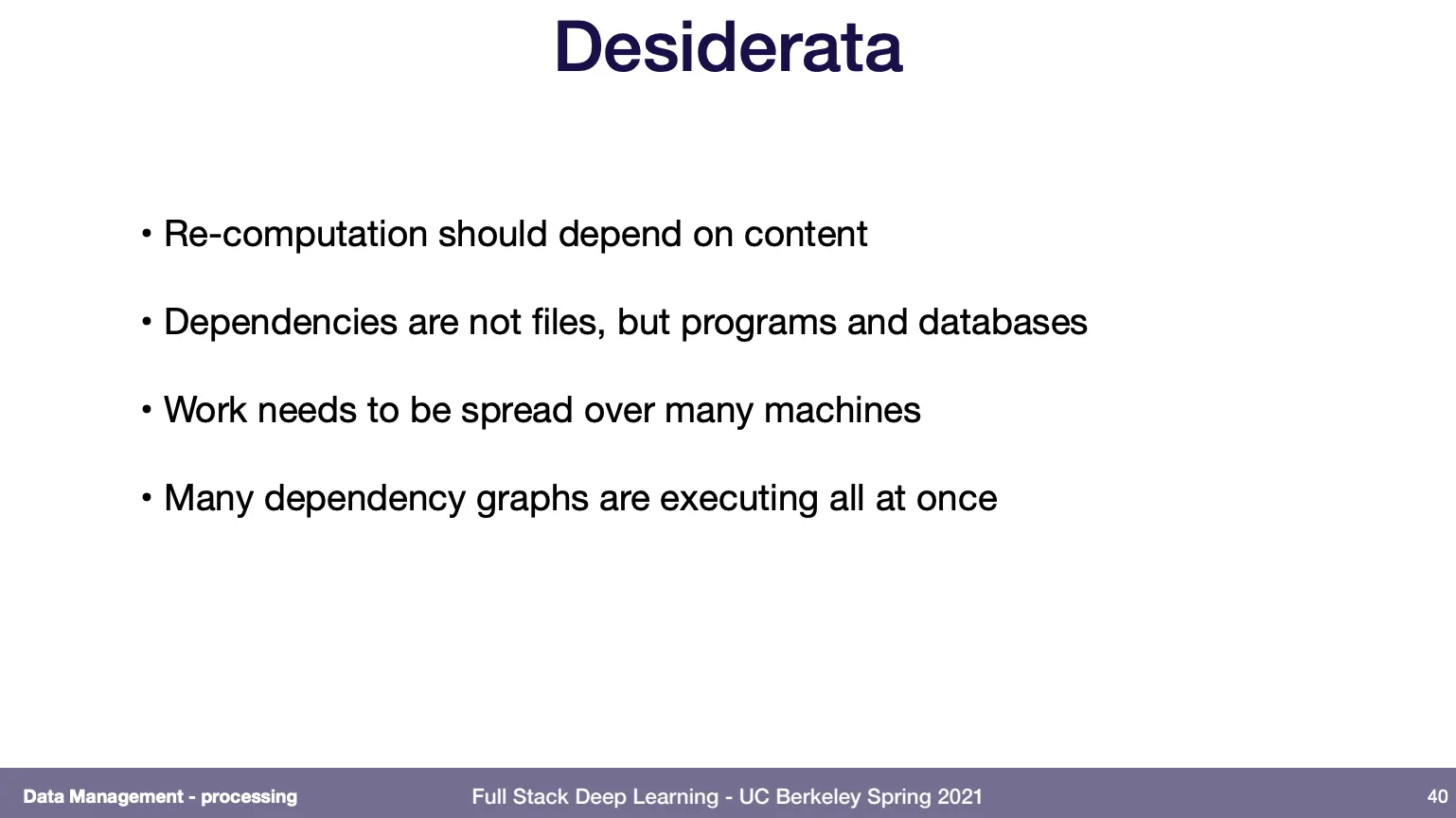 첫째, 워크플로우 프로세스는 작업들의 복잡한 의존관계를 관리할 수 있어야 한다. 복잡한 의존관계라고 함은 단순한 파이프라인이 아닐 수 있다는 말이다. 둘째, 워크플로우의 의존관계를 구성하는 요소들은 파일에 국한되지 않아야 한다. 프로그램이나 함수의 출력값에 의존할수도 있고(참고2), 데이터베이스에 의존할수도 있다(from2,3:파일과 데이터베이스는 다르다). 셋째, 작업들이 분산되어 처리될 수 있도록 자원을 관리할 수 있어야 한다.