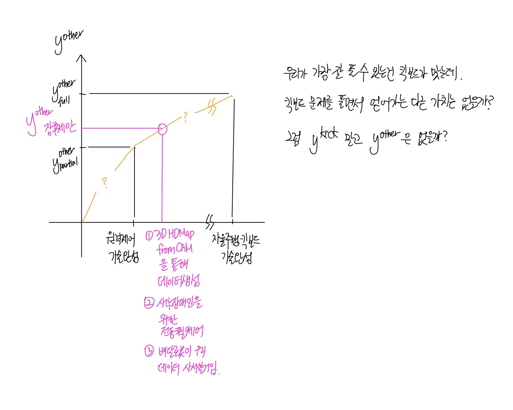 “삼륜 킥보드 이용량" 이 적더라도, 우리가 얻게 되는 기술력과 부산물이 만들어내는 가치들이 충분히 많은 경우에는 자율주행팀에 대해 더욱 리소스를 쏟을 수 있으리라 생각했어. 내가 생각한 부산물이 만들 수 있는 가치는, 3D HD Map 으로 데이터를 생성해서 배달로봇 등 인도 중심의 로봇들이 자율주행 태스크에 활용할 수 있는 데이터를 생성해낼 수 있는 능력을 가지는 것 (참고4), 시각장애인을 위한 전동휠체어 소프트웨어를 온전히 만들 수 있는 능력을 가지는 것 (참고4) 정도를 생각해냈어. 형은 사업계획서에 이마트 에브리데이 관련된 내용을 적어넣었고. 또 무엇이 있을까? 이걸 좀 고민을 해야할것같아.