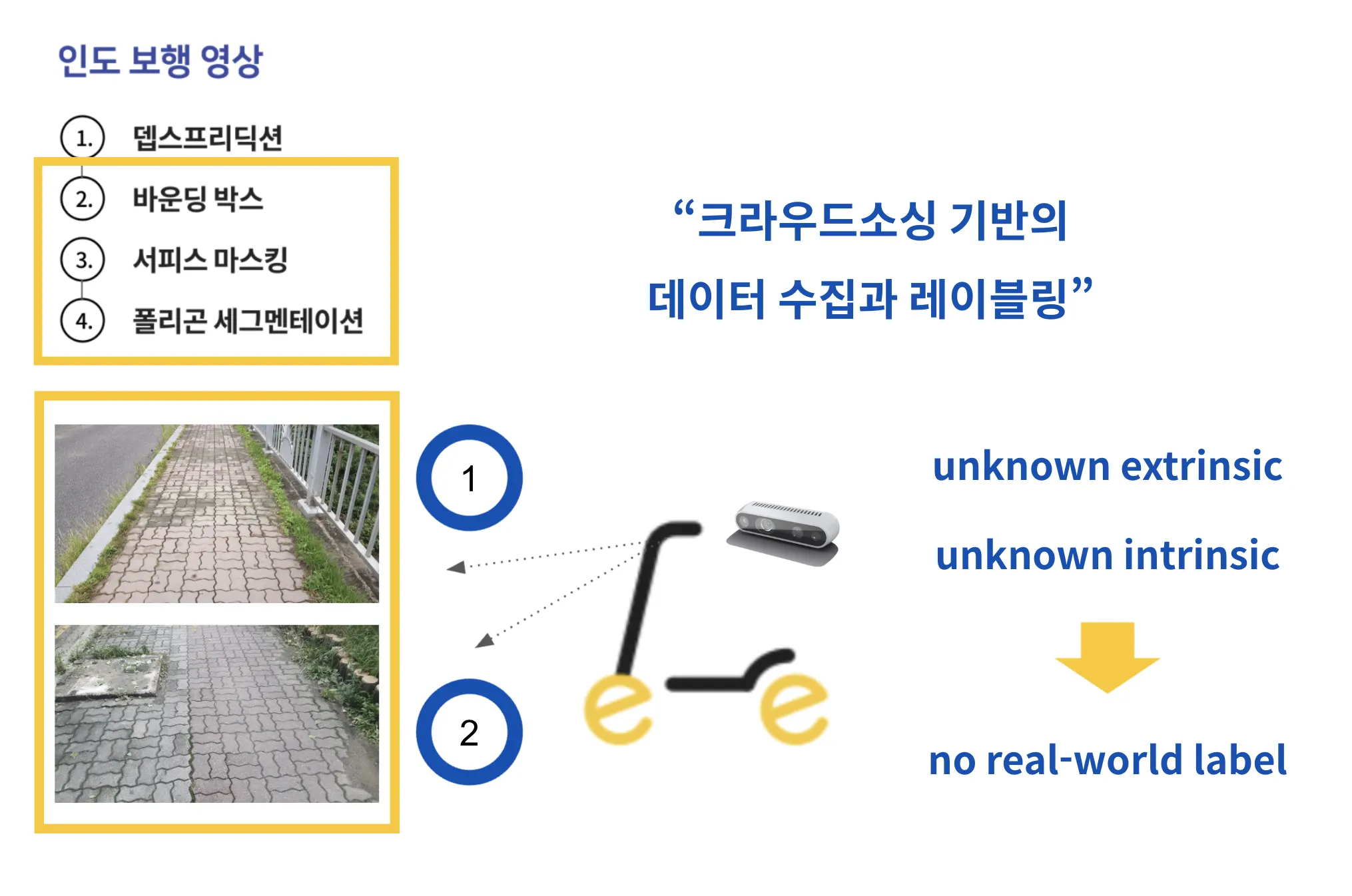 Ai hub 보행자 데이터셋에는, depth prediction 서브셋을 제외한 모든 서브셋들에 촬영 당시 카메라의 intrinsic 과 extrinsic 이 존재하지 않는다. 실제 촬영 영상을 보면, 크라우드소싱 기반의 데이터 수집 특성상 촬영한 각도가 제각각이다. 이건 기구에 맞도록 데이터셋을 구축하는 것은 고사하고 이 데이터셋에 꼭 맞도록 카메라를 장착하는 것 자체가 어려울 수 있다는 것을 의미한다. 이 데이터셋을 Real world 문제에 접목시키고자 한다면, 카메라의 pitch 에 자유도를 갖는 기구를 제작해야 한다.