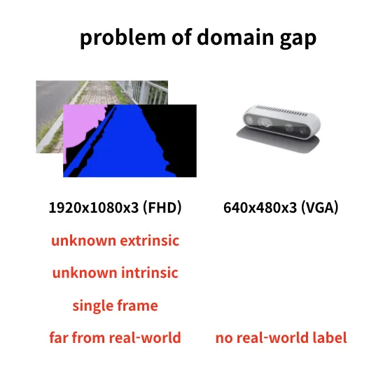 또한 real world 에서 구동되는 기기 특성상 training 시에 나누었던 test set 을 벤치마크로 곧이곧대로 사용할 수 없다. 그렇다고 카메라 intrinsic, extrinsic 에 대한 정보가 없다면 우리의 기구에 맞는 벤치마크 데이터셋을 구축할 수 없다. 단적인 예로 구축된 데이터셋은 굉장히 선명했고, motion blur 라고는 찾아볼 수 없었다. 크라우드소싱이라면 대부분의 영상이 스마트폰을 통해 촬영됐을텐데, 이것이 '진짜 raw 값' 을 가지고 있는건지, 스마트폰의 자체 후처리가 들어간 것인지 알 수 없다.