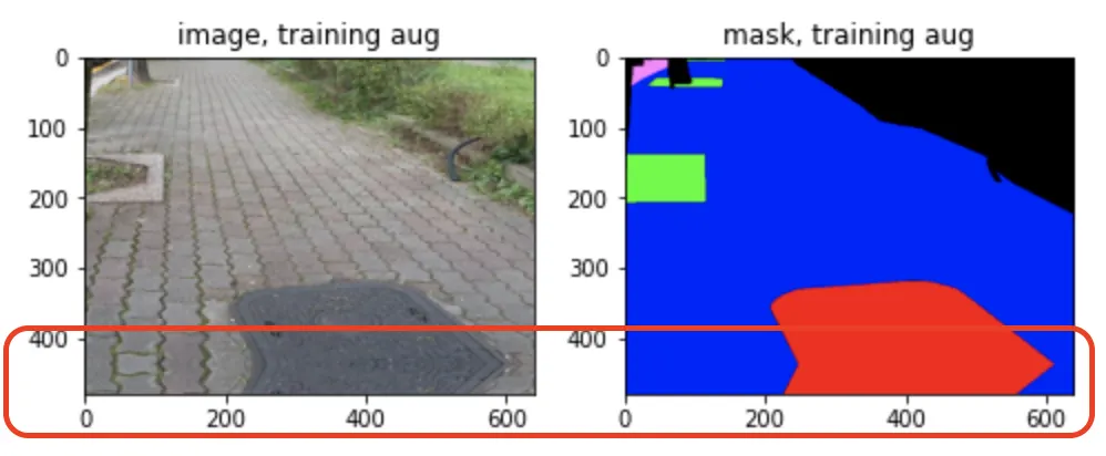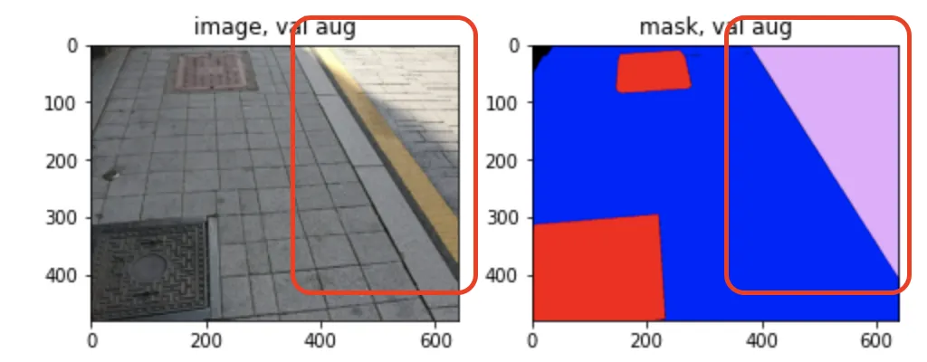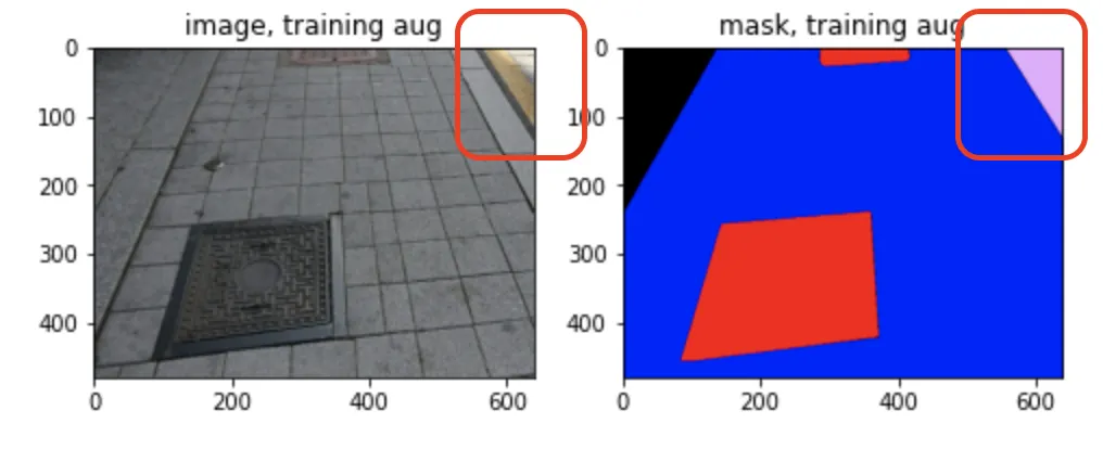 이런 문제를 완화하기 위해서는 지구 좌표계로 해당 지역의 정보를 담고 있는 메타데이터 쌍을 제공하거나, 해당 데이터가 수집되기 전후의 영상 정보를 취득하거나, 카메라에 보이지 않는 부분의 영상을 취득할 수 있어야 한다. 하지만 그런 정보가 제공되지 않는 데이터셋의 특성 (크라우드소싱, 인접한 시간에 촬영된 영상이 없음) 때문에, 영상 구석의 정보라도 잃어버리지 않고 보전할 수 있도록 데이터셋을 구성하는 것이 중요하다. 보도와 차도는 연속적으로 이어진다는 특징이 있으므로, cropping 되는 영상을 최대한 줄이고 mirror augmentation 을 통해 보완한다.