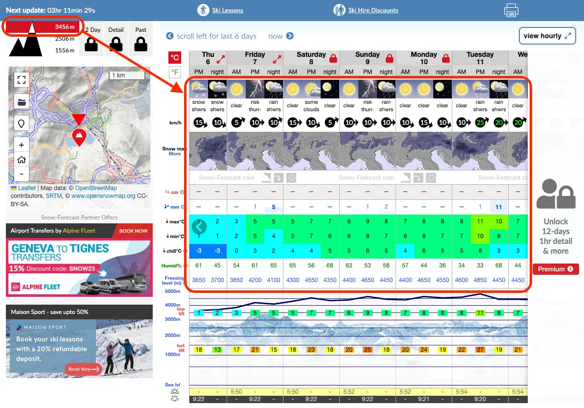 슬로프 고점과 저점 고도폭이 큰 스키장에 가면 고도에 따라 온도가 크게 달라진다는 것을 정말 실감나게 느낄 수 있습니다. 아래 링크에서는 어느 고도에서부터 눈이 고체 상태로 존재할 수 있는지를 볼 수 있다는 점에서 유용합니다. 특히 빠른 겨울철이나 초봄에 스키를 타러 가는 경우 괜찮은 설질의 슬로프가 존재할 수 있는 것인지를 확인하는 일에 사용될 수 있습니다.
