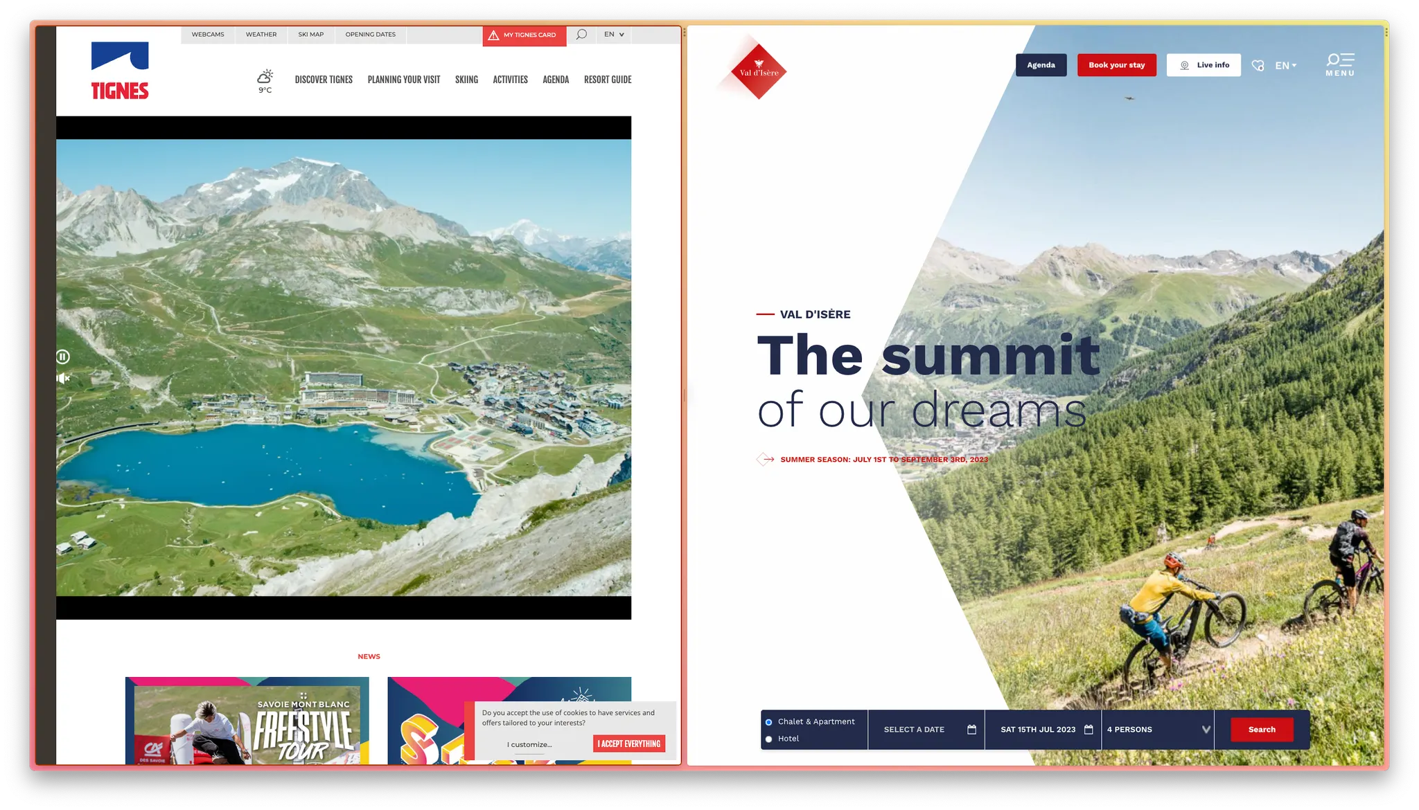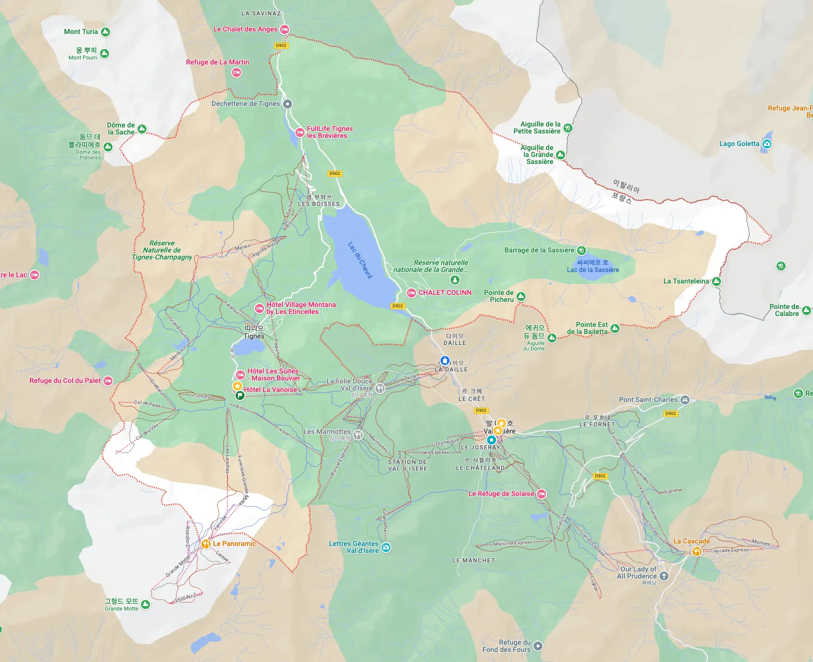 그런데 여기는 아닙니다. 1개의 산맥을 n개의 회사가 나누어 사용합니다. 제가 방문했던 스키장은 사부아 지역에 위치한 따니흐-발디세흐(Tignes - Val d’Isere) 스키장입니다. 언뜻 보기에는 하나의 스키장처럼 보이곤 합니다. 하지만 사실은 따니흐를 관리하는 회사와 발디세흐를 관리하는 회사, 두 개의 독립된 회사에서 관리하는 두 개의 스키장이 공동의 이익을 위해 일부 슬로프와 리프트를 공유하고 있는 것입니다. 대한민국 최대 스키장이라고 불리는 용평리조트의 경우 리프트가 14개이지만, 따니흐와 발디세흐를 합하면 리프트가 무려 80개입니다.
