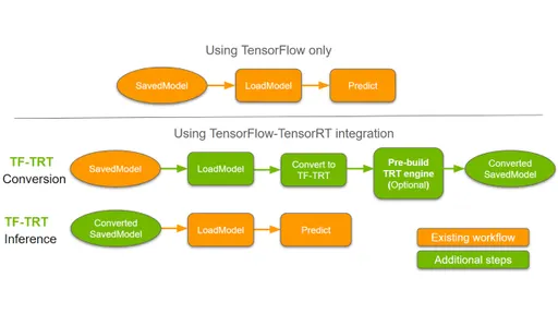 Cons: Need to store the whole TensorFlow library in HDD (a disadvantage for the deployment environment); need to load TensorFlow into memory at runtime; usually runs more slowly than pure TensorRT engine.