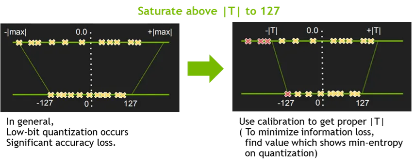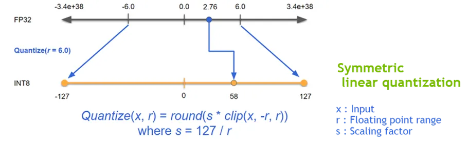 딥러닝의 학습 및 추론에서 정밀도(Precision)를 낮추는 일은 거의 일반적인 방법이 되었다. 낮은 정밀도를 가지는 신경망일수록 데이터의 크기 및 가중치들의 bit 수가 작기 때문에 더 빠르고 효율적인 연산이 가능하다. 이를 위한 양자화 기법중 TensorRT는 Symmetric Linear Quantization 을 사용하고 있으며, 이를 통하여 딥러닝 프레임워크의 일반적인 FP32의 데이터를 FP16 및 INT8 의 데이터 타입으로 정밀도를 낮출 수 있다.