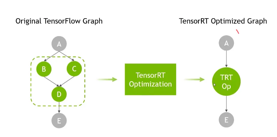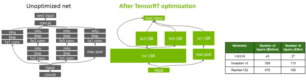 일반적으로 그래프 최적화는 딥러닝 신경망에서 사용되는 아주 원시적인 (Primitive computation. 예를 들어, Add) 연산 형태, 복합적인 (Compound computation, 예를 들어, Convolution) 연산 형태의 그래프 노드들을 각 플랫폼에 최적화된 코드들로 구성하기 위하여 사용된다. TensorRT 에서는 이를 실현하기 위해 Layer Fusion 방식과 Tensor Fusion 방식을 동시에 적용하고 있다. Layer Fusion은 Vertical Layer Fusion, Horizontal Layer Fusion이 적용되고,또한 Tensor Fusion이 적용되어 모델 그래프를 단순화 시켜주어 모델의 Layer 수가 크게 감소하게 된다. 실제로 TensorRT를 사용하여 ResNet, MobileNet 과 같은 백본 신경망들을 최적화 하면 기존 노드 수가 몇 십배 까지 줄어드는 효과를 보았었다.