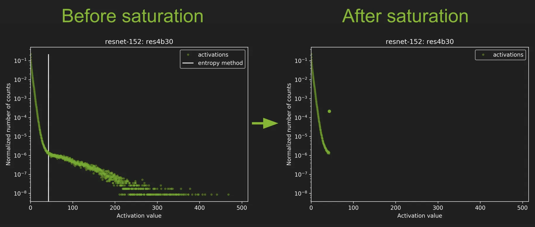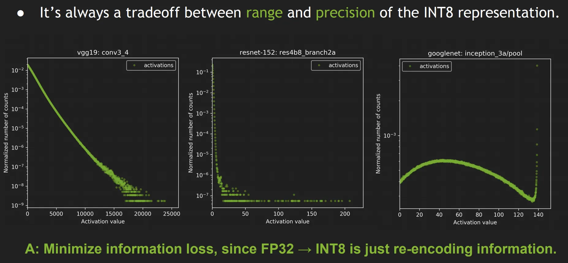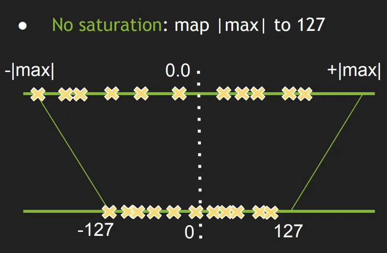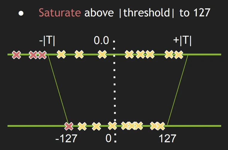 당연히 INT8 양자화를 수행한다면 weights and activations 을 GPU 에 8bit integer 형태로 저장을 해야 하므로, weights and activations 에서 처리되는 Float 값들을 적절한 범위로 변환해야 한다.
