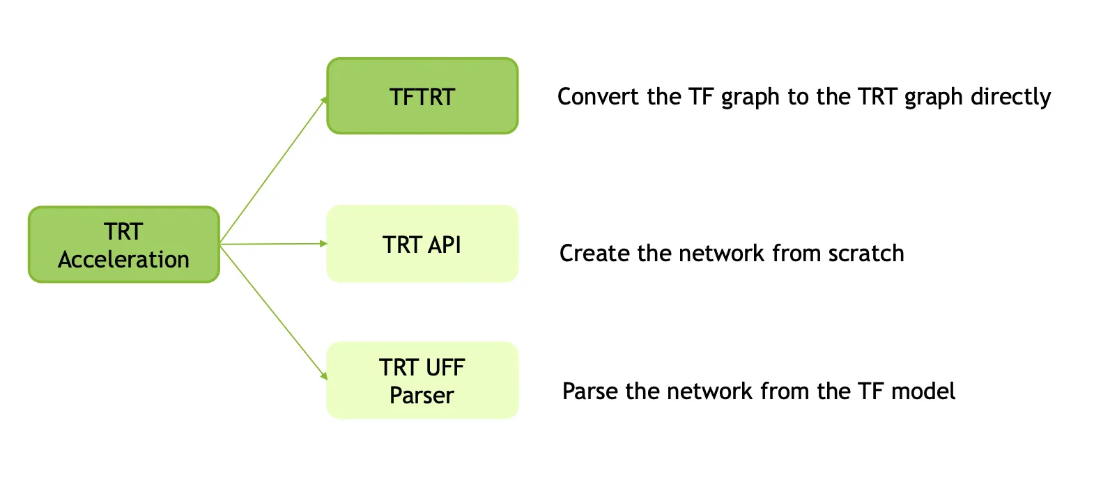 이렇게 생긴 그림에서, 2-1 부터 설명할 TF-TRT 는 진한 초록색으로 표시된 부분에 해당한다. TRT 를 사용하는 다양한 방법들 중tensorflow 와 함께 설치되는 tensorrt 만을 활용해서 NVIDIA 그래픽카드의 가속을 시도하는 방법일 뿐이다.